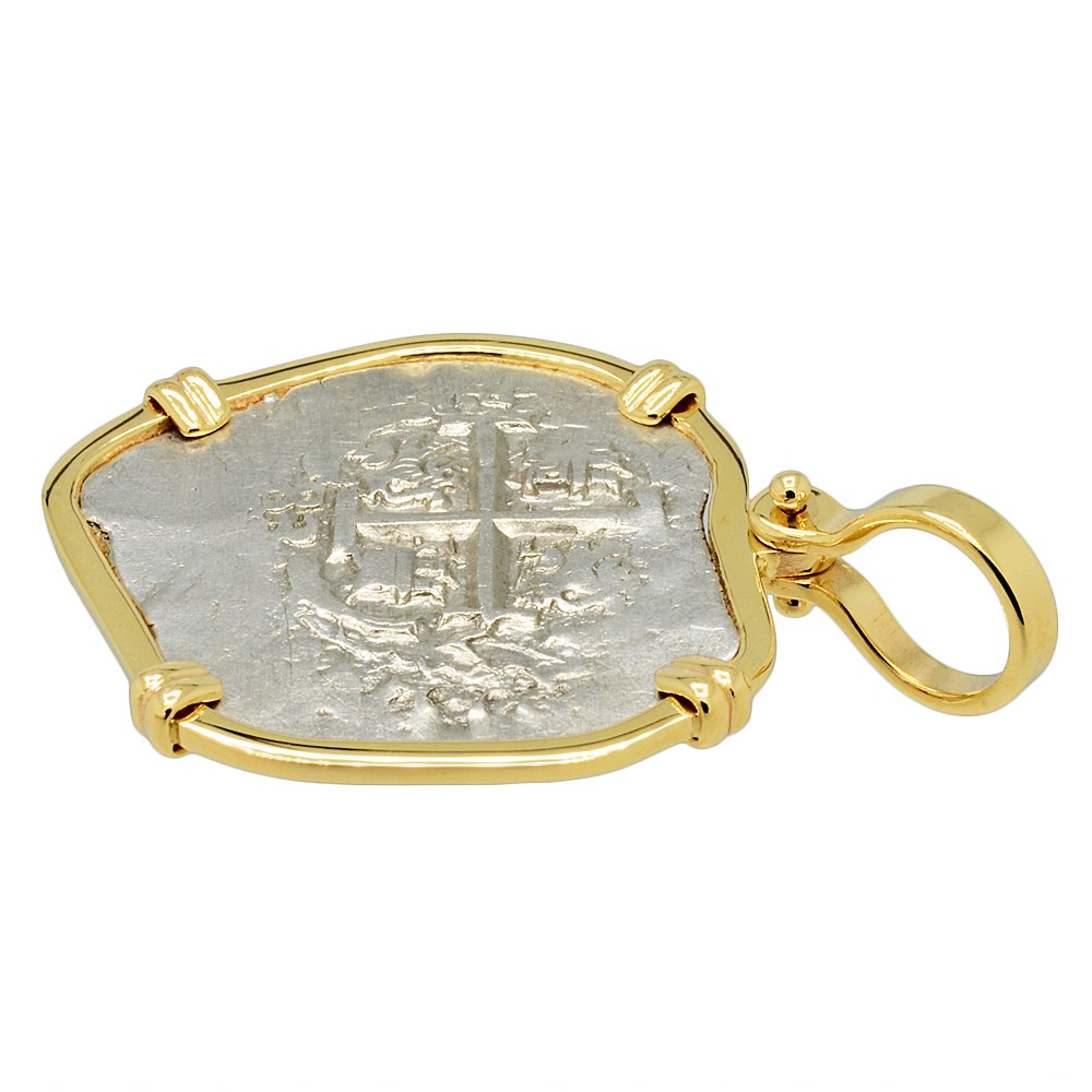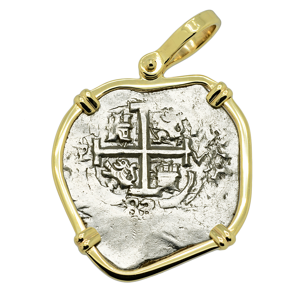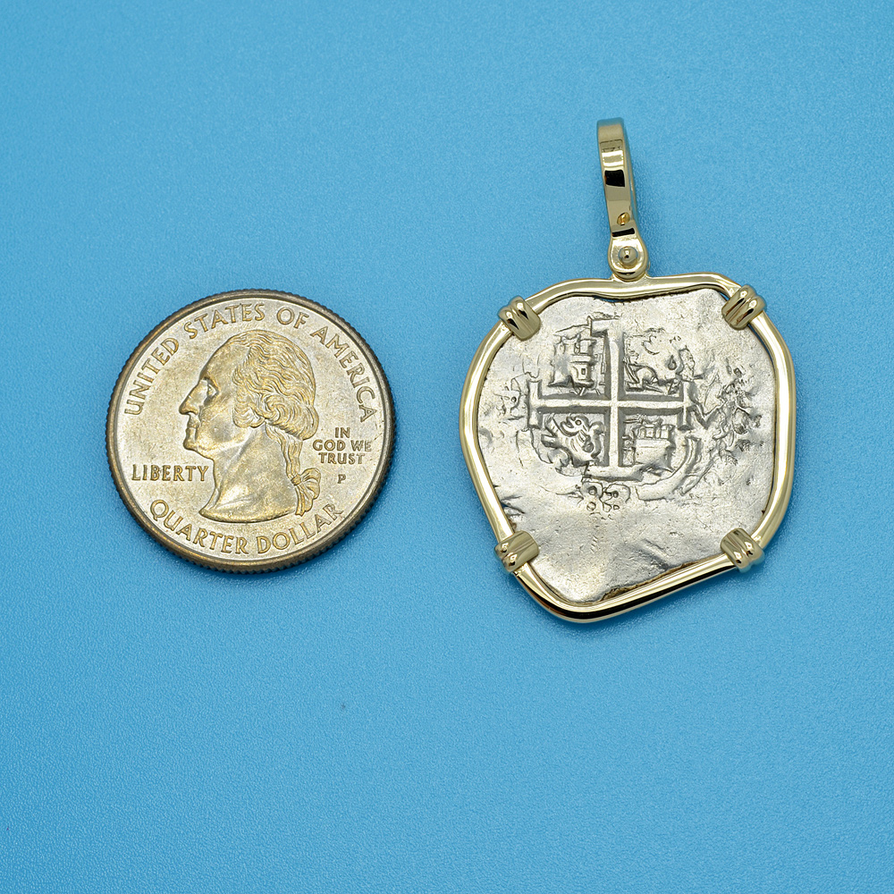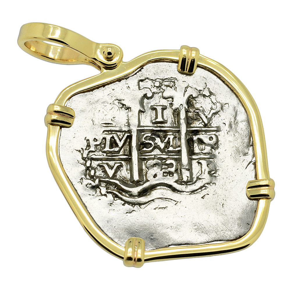 This is a genuine Spanish silver coin that was minted in the colonial South American mint of Potosi, Peru. In 1533, four decades after Columbus landed in the New World, Spanish conquistador Francisco Pizarro conquered the Inca Empire in Peru. Soon after, high in the Andes Mountains at Potosi, the Spanish discovered the richest silver deposits in the world and in 1575 they opened the mint in Potosi.