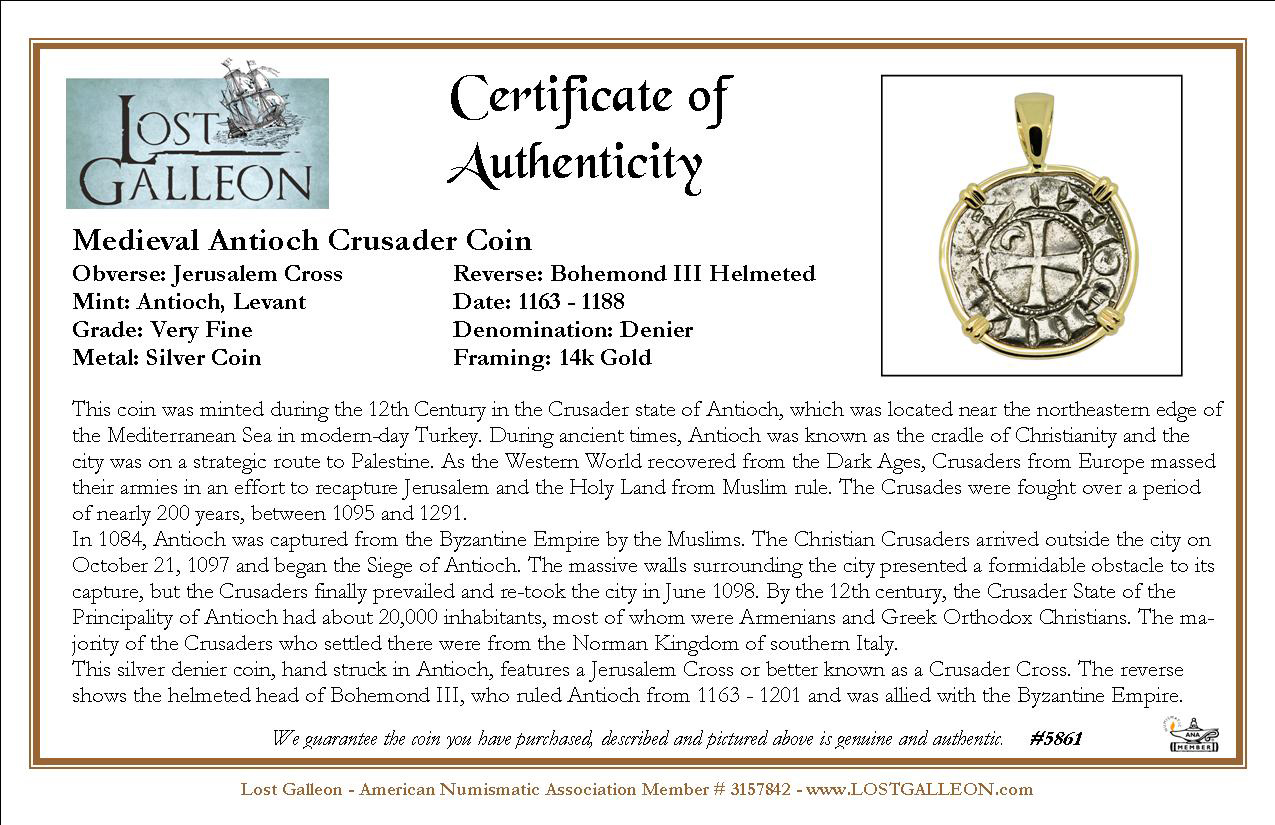 This silver denier coin, hand struck in Antioch, features a Jerusalem Cross or better known as a Crusader Cross. The reverse shows the helmeted head of Bohemond III, who ruled Antioch from 1163 - 1201 and was allied with the Byzantine Empire.