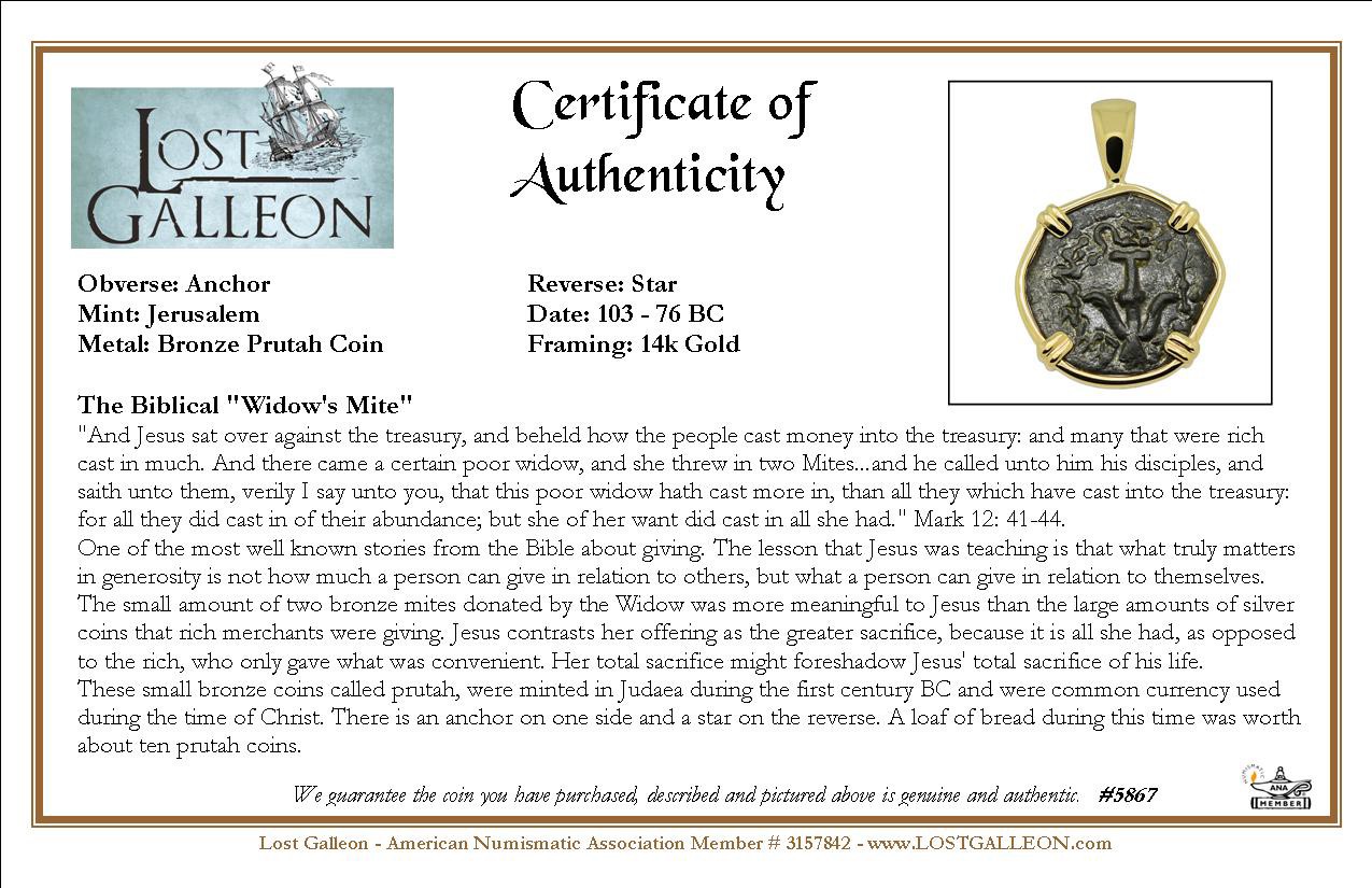 These small bronze coins called prutah, were minted in Judaea during the first century BC and were common currency used during the time of Christ. There is an anchor on one side and a star on the reverse. A loaf of bread during this time was worth about ten prutah coins.