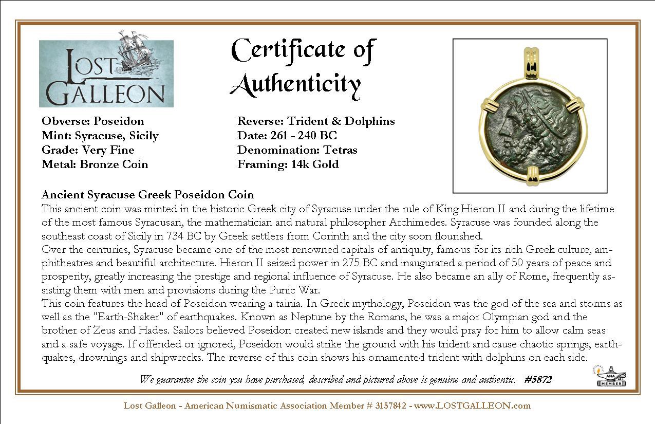 This ancient coin was minted in the historic Greek city of Syracuse under the rule of King Hieron II and during the lifetime of the most famous Syracusan, the mathematician and natural philosopher Archimedes. Syracuse was founded along the southeast coast of Sicily in 734 BC by Greek settlers from Corinth and the city soon flourished.