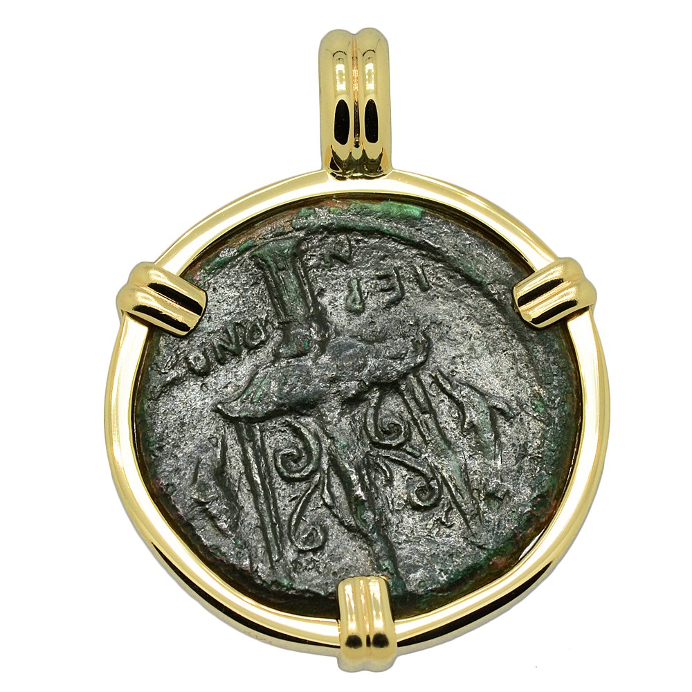 This coin features the head of Poseidon wearing a tainia. In Greek mythology, Poseidon was the god of the sea and storms as well as the "Earth-Shaker" of earthquakes. Known as Neptune by the Romans, he was a major Olympian god and the brother of Zeus and Hades. Sailors believed Poseidon created new islands and they would pray for him to allow calm seas and a safe voyage. If offended or ignored, Poseidon would strike the ground with his trident and cause chaotic springs, earthquakes, drownings and shipwrecks. The reverse of this coin shows his ornamented trident with dolphins on each side.