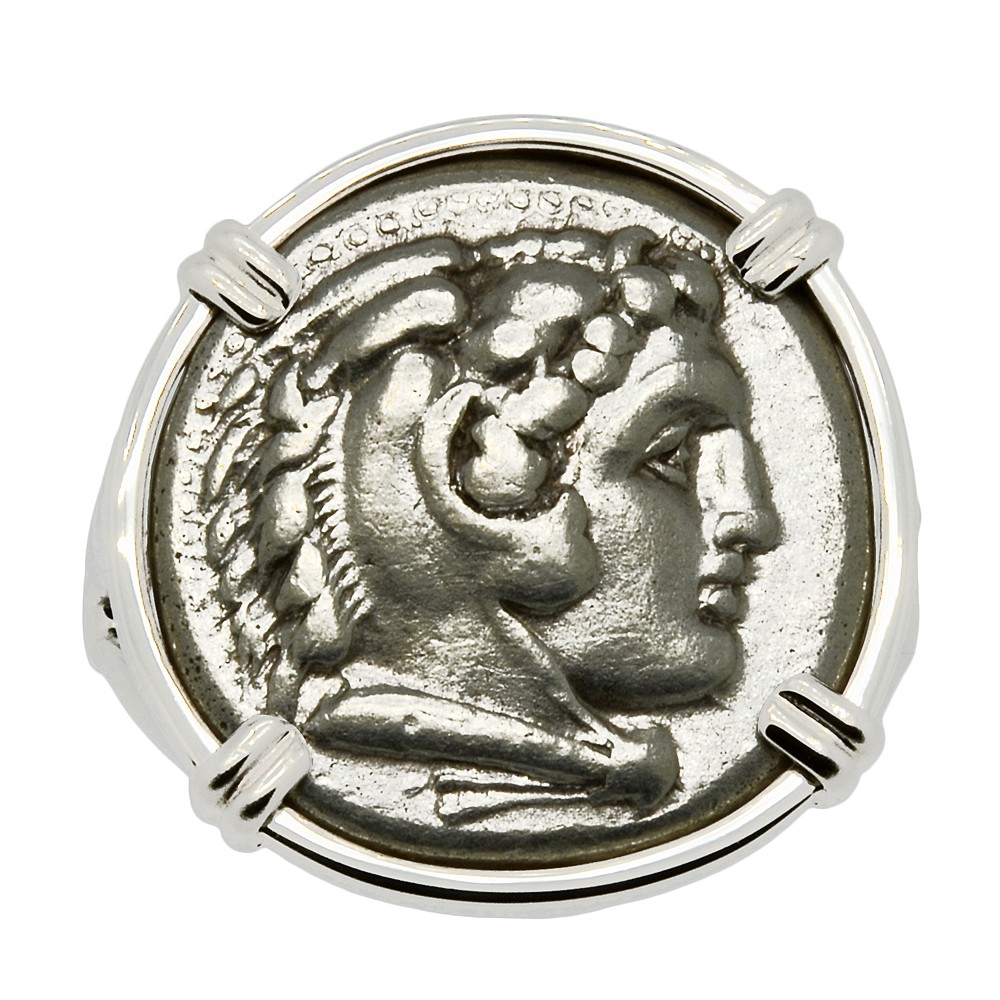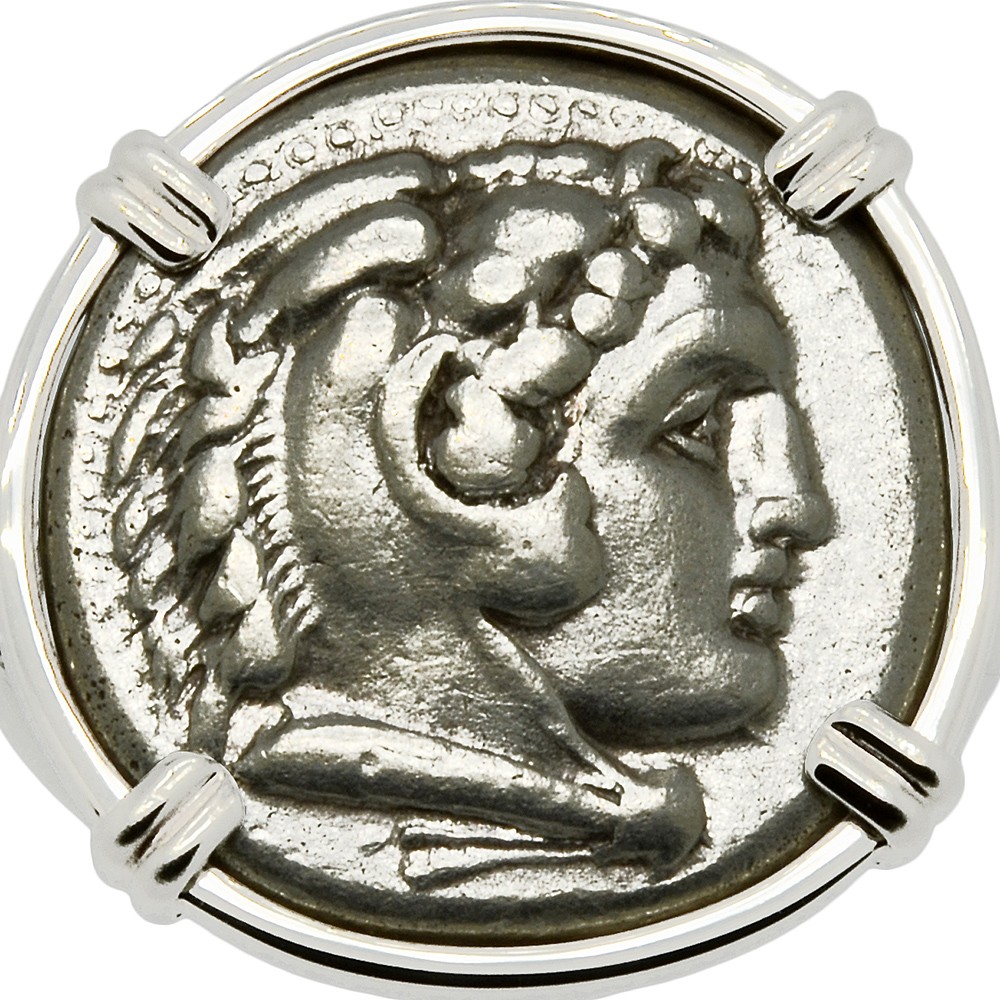 The obverse side of this coin shows the Greek hero Hercules wearing a lion’s skin of armor. This was important to Alexander's hereditary line, as he claimed to be descended from the mythological hero. The reverse shows Zeus, the king of the Greek gods, seated on a throne and holding an eagle with Alexander’s name to the right. Zeus was the most powerful of all the Greek gods and his appearance on Alexander's coinage symbolized Alexander's status as leader of all the Greeks.