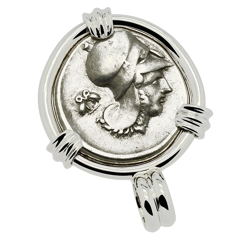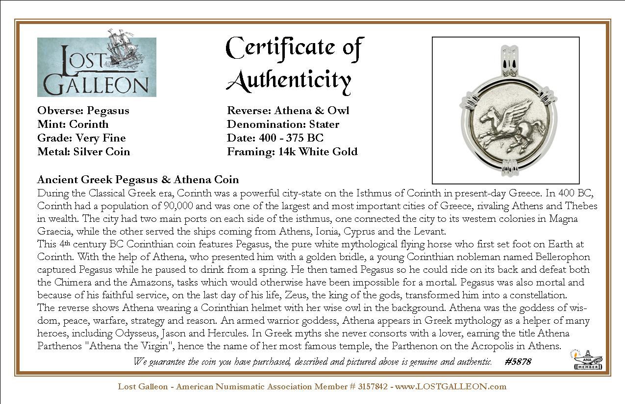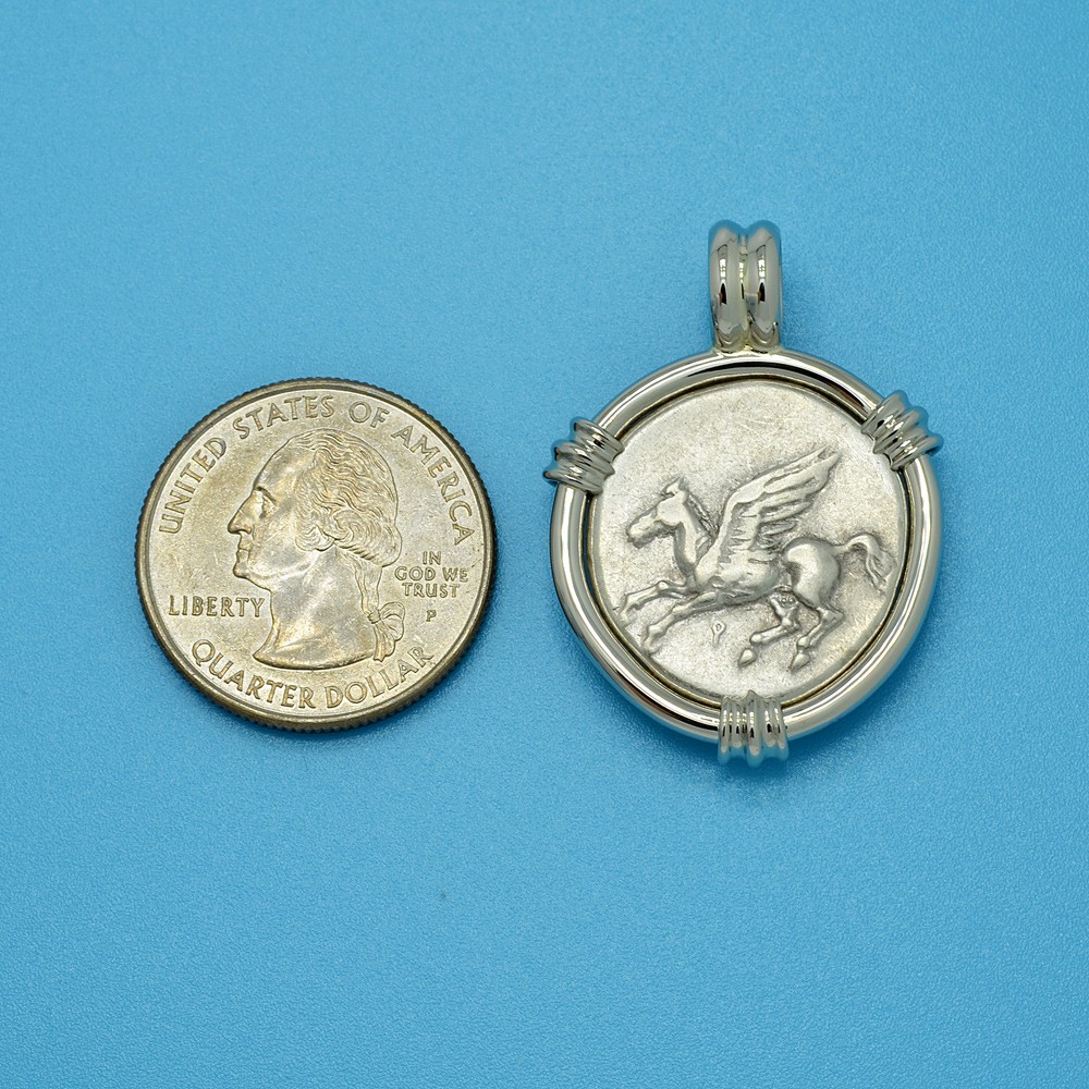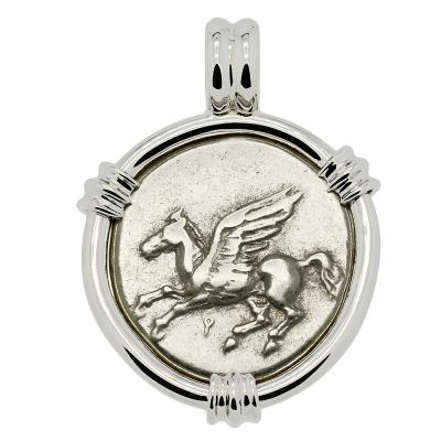 This 4th century BC Corinthian coin features Pegasus, the pure white mythological flying horse who first set foot on Earth at Corinth. With the help of Athena, who presented him with a golden bridle, a young Corinthian nobleman named Bellerophon captured Pegasus while he paused to drink from a spring. He then tamed Pegasus so he could ride on its back and defeat both the Chimera and the Amazons, tasks which would otherwise have been impossible for a mortal. Pegasus was also mortal and because of his faithful service, on the last day of his life, Zeus, the king of the gods, transformed him into a constellation.