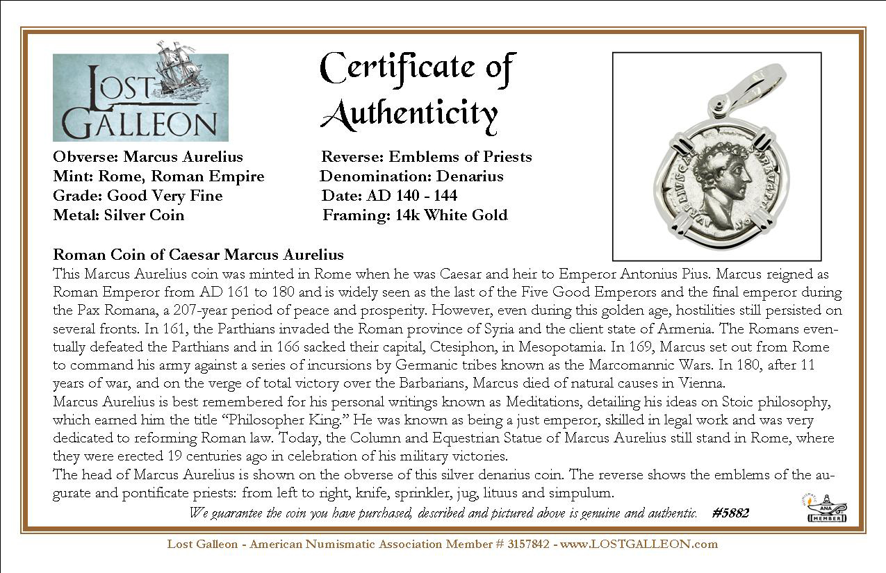 The head of Marcus Aurelius is shown on the obverse of this silver denarius coin. The reverse shows the emblems of the augurate and pontificate priests: from left to right, knife, sprinkler, jug, lituus and simpulum.