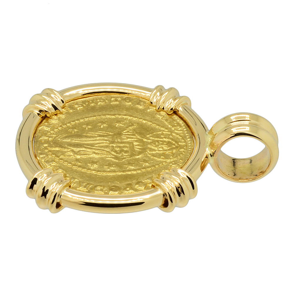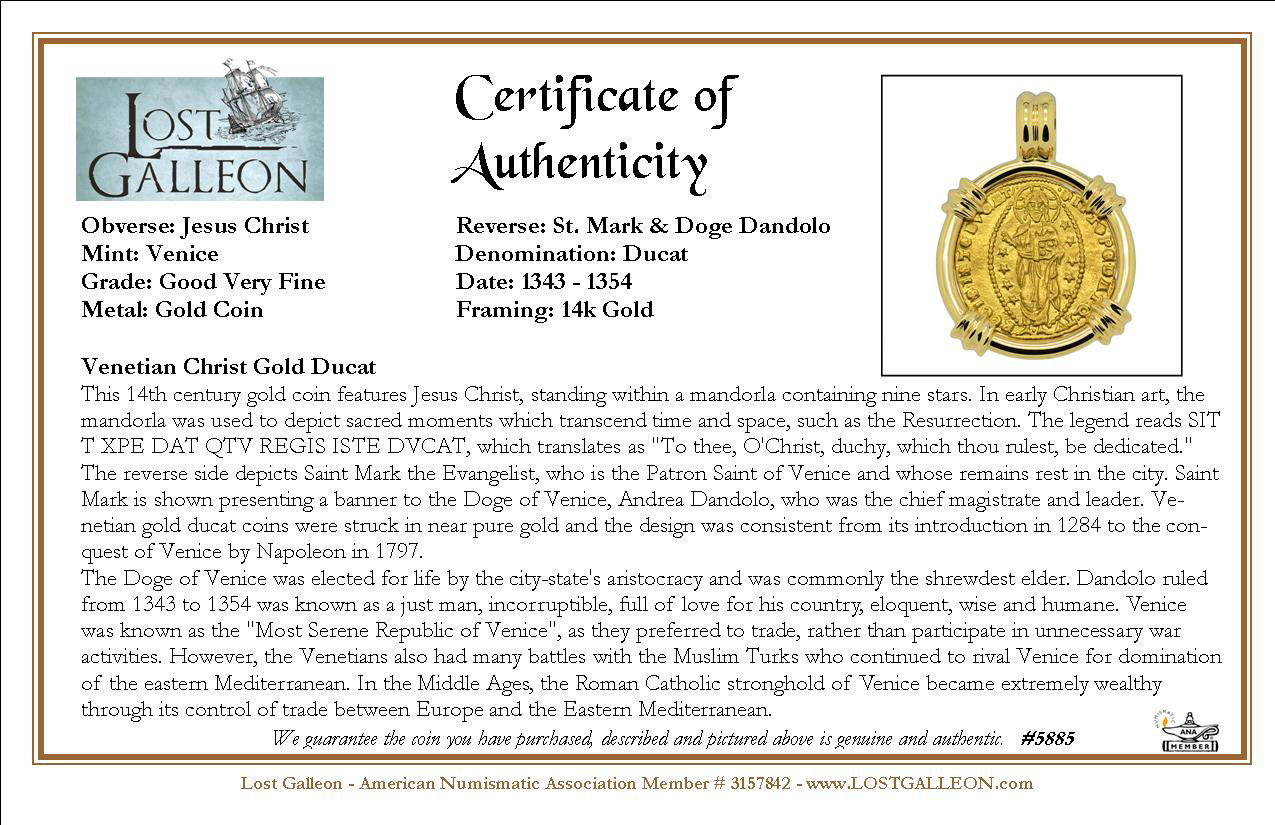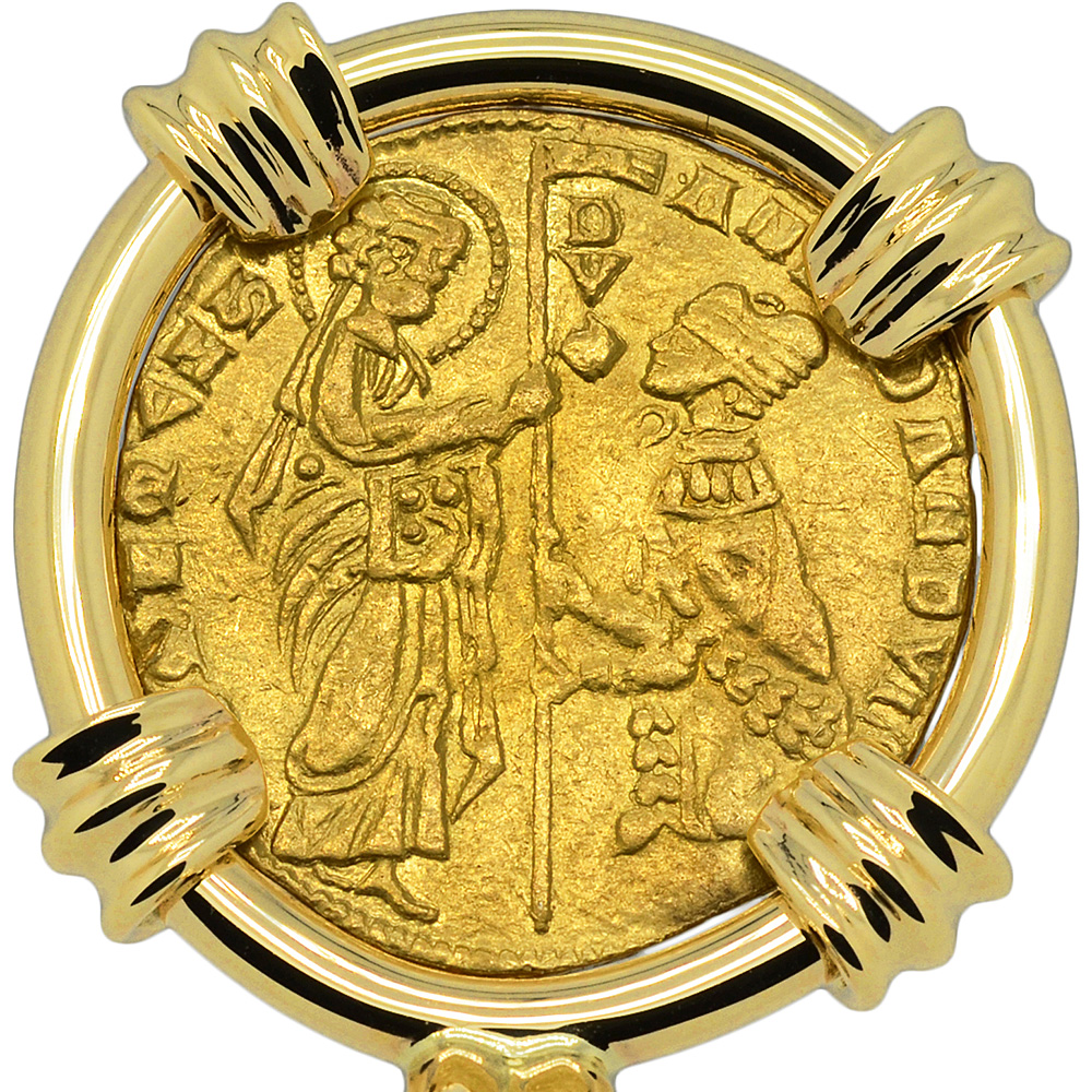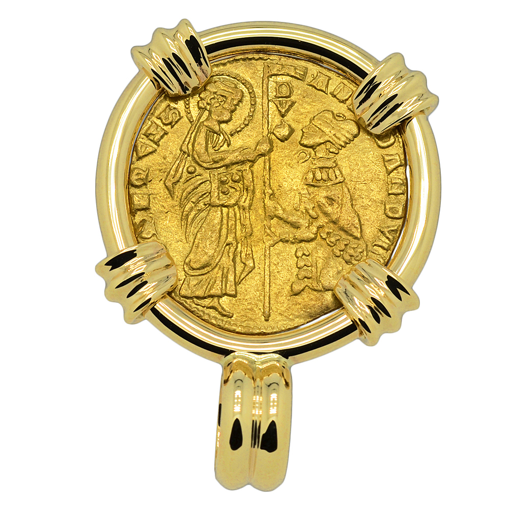 This 14th century gold coin features Jesus Christ, standing within a mandorla containing nine stars. In early Christian art, the mandorla was used to depict sacred moments which transcend time and space, such as the Resurrection. The legend reads SIT T XPE DAT QTV REGIS ISTE DVCAT, which translates as "To thee, O'Christ, duchy, which thou rulest, be dedicated." The reverse side depicts Saint Mark the Evangelist, who is the Patron Saint of Venice and whose remains rest in the city. Saint Mark is shown presenting a banner to the Doge of Venice, Andrea Dandolo, who was the chief magistrate and leader. Venetian gold ducat coins were struck in near pure gold and the design was consistent from its introduction in 1284 to the conquest of Venice by Napoleon in 1797.