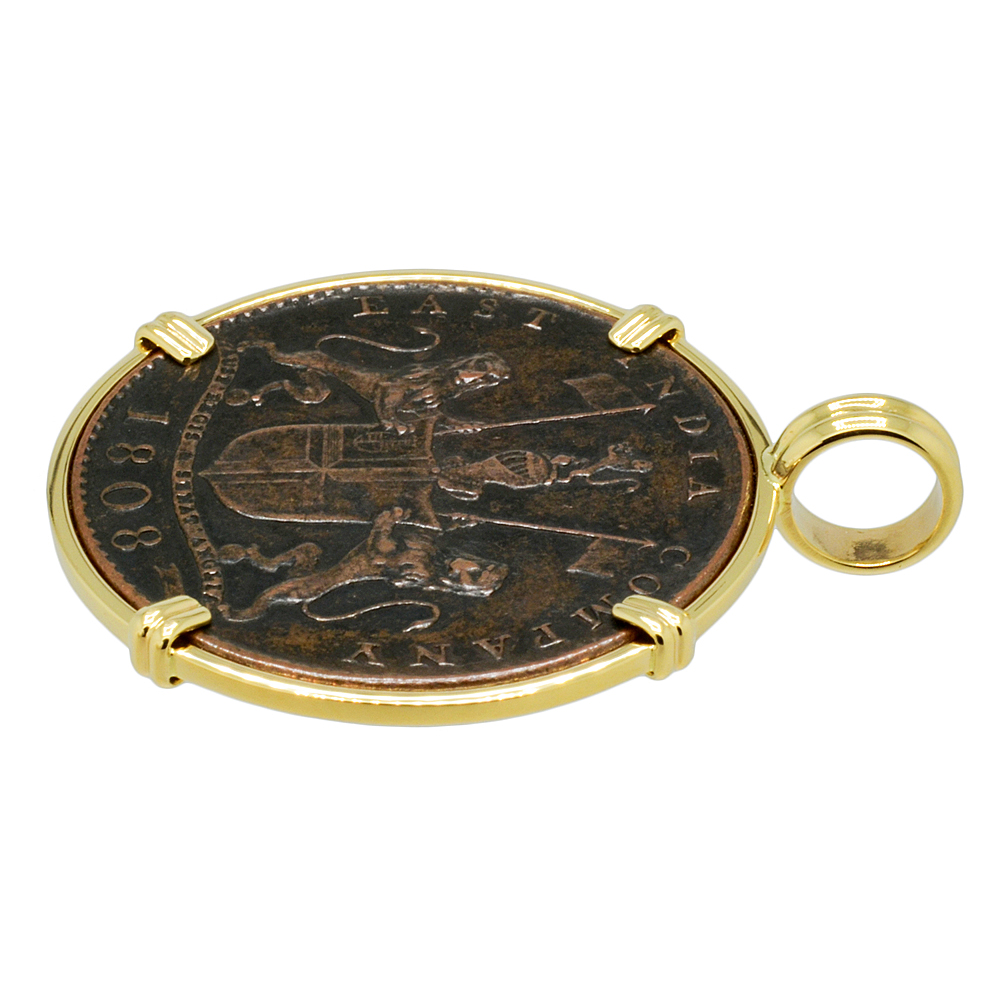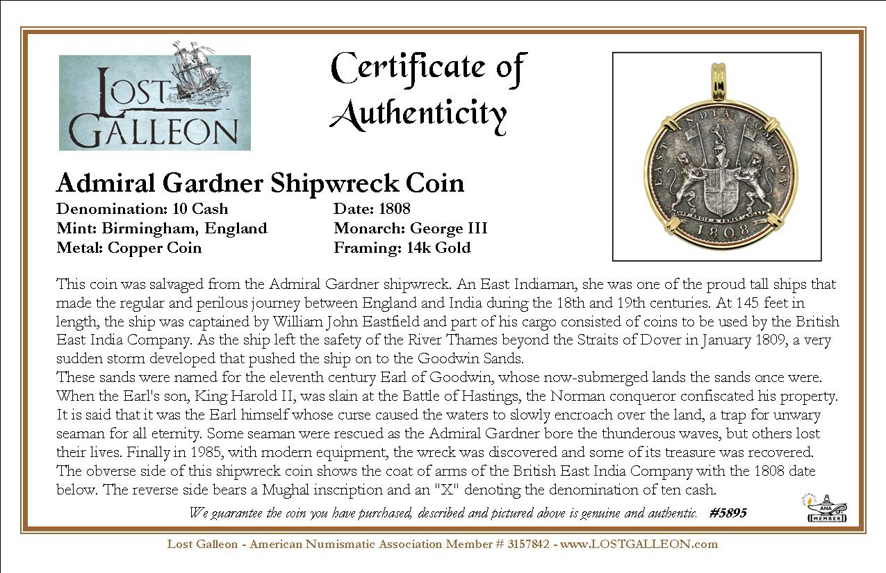 This coin was salvaged from the Admiral Gardner shipwreck. An East Indiaman, she was one of the proud tall ships that made the regular and perilous journey between England and India during the 18th and 19th centuries. At 145 feet in length, the ship was captained by William John Eastfield and part of his cargo consisted of coins to be used by the British East India Company. As the ship left the safety of the River Thames beyond the Straits of Dover in January 1809, a very sudden storm developed that pushed the ship on to the Goodwin Sands.