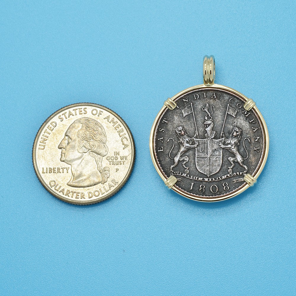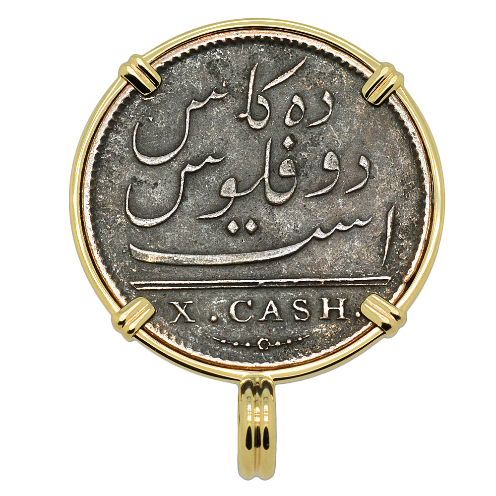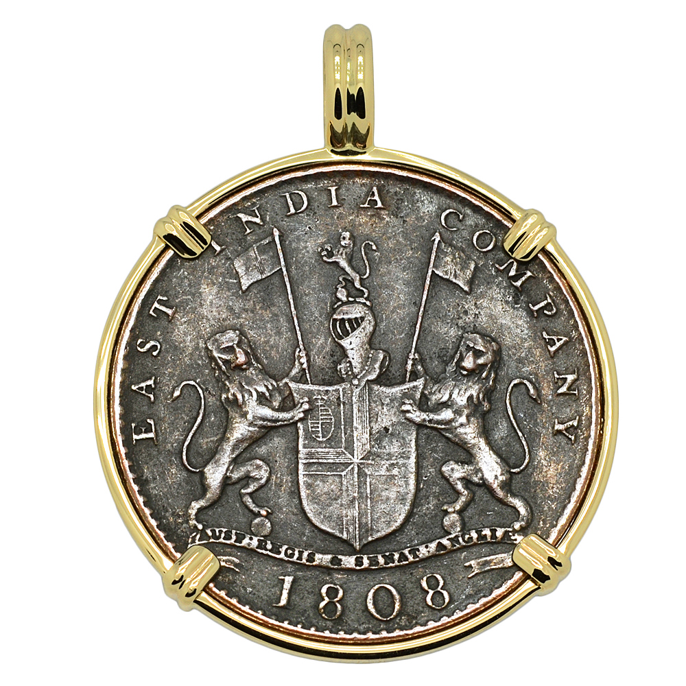 The obverse side of this shipwreck coin shows the coat of arms of the British East India Company with the 1808 date below. The reverse side bears a Mughal inscription and an "X" denoting the denomination of ten cash.