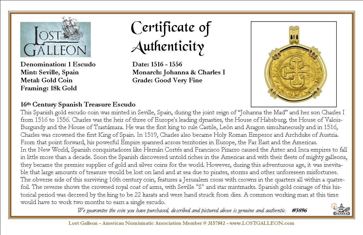 This Spanish gold escudo coin was minted in Seville, Spain, during the joint reign of “Johanna the Mad” and her son Charles I from 1516 to 1556. Charles was the heir of three of Europe's leading dynasties, the House of Habsburg, the House of Valois-Burgundy and the House of Trastámara. He was the first king to rule Castile, León and Aragon simultaneously and in 1516, Charles was crowned the first King of Spain. In 1519, Charles also became Holy Roman Emperor and Archduke of Austria. From that point forward, his powerful Empire spanned across territories in Europe, the Far East and the Americas.