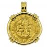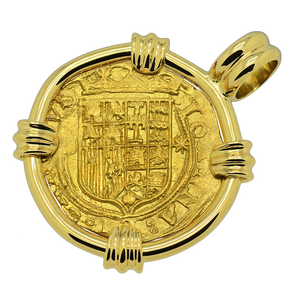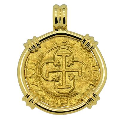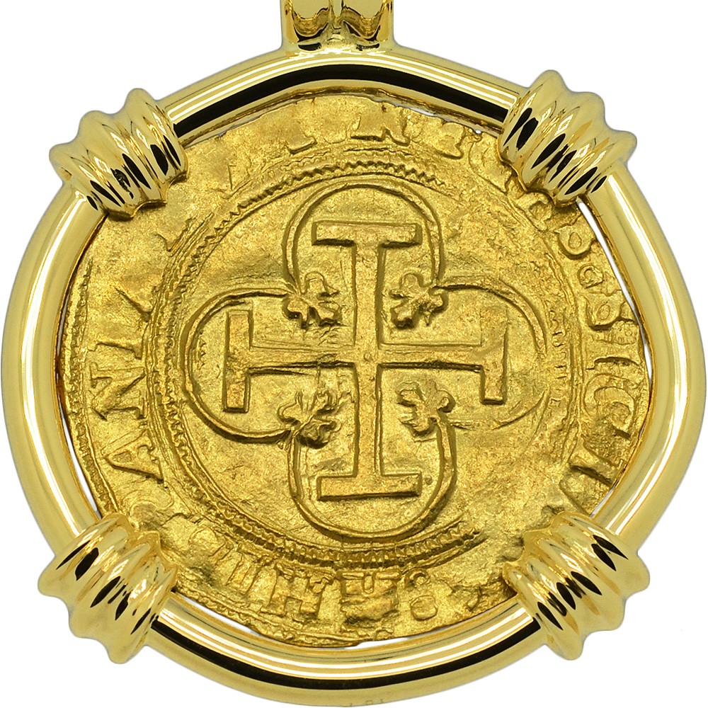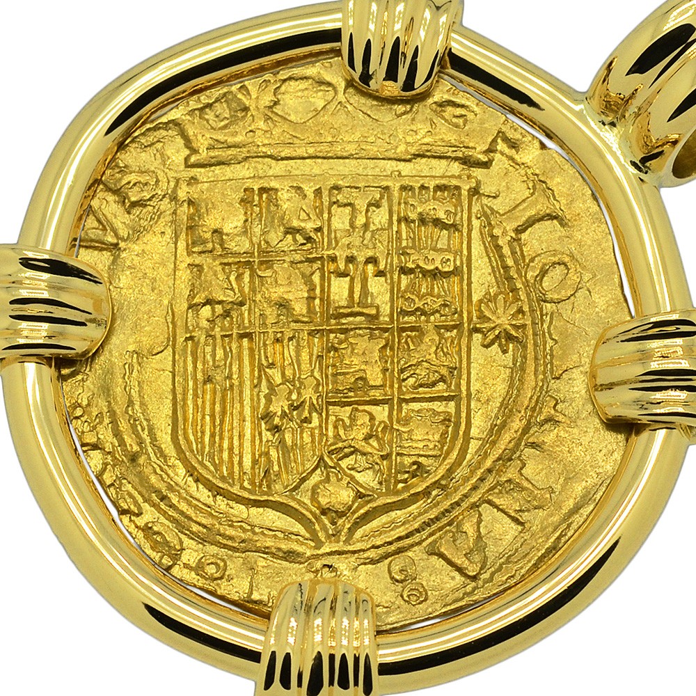 The obverse side of this surviving 16th century coin, features a Jerusalem cross with crowns in the quarters all within a quatrefoil. The reverse shows the crowned royal coat of arms, with Seville "S" and star mintmarks. Spanish gold coinage of this historical period was decreed by the king to be 22 karats and were hand struck from dies. A common working man at this time would have to work two months to earn a single escudo.