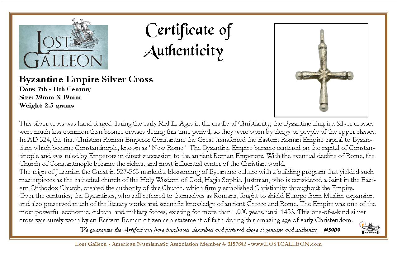 Over the centuries, the Byzantines, who still referred to themselves as Romans, fought to shield Europe from Muslim expansion and also preserved much of the literary works and scientific knowledge of ancient Greece and Rome. The Empire was one of the most powerful economic, cultural and military forces, existing for more than 1,000 years, until 1453. This one-of-a-kind silver cross was surely worn by an Eastern Roman citizen as a statement of faith during this amazing age of early Christendom.