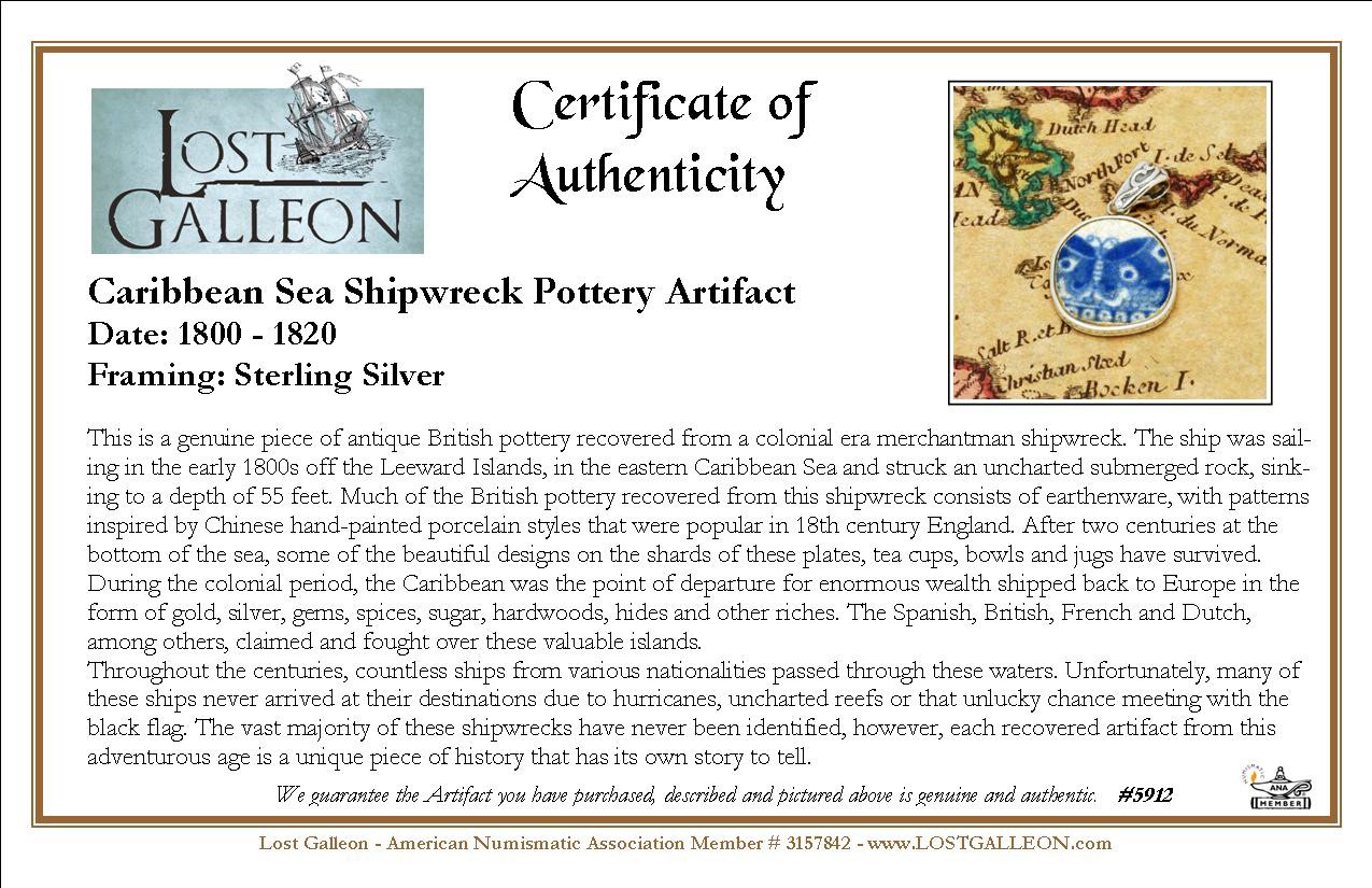 This is a genuine piece of antique British pottery recovered from a colonial era merchantman shipwreck. The ship was sailing in the early 1800s off the Leeward Islands, in the eastern Caribbean Sea and struck an uncharted submerged rock, sinking to a depth of 55 feet. Much of the British pottery recovered from this shipwreck consists of earthenware, with patterns inspired by Chinese hand-painted porcelain styles that were popular in 18th century England. After two centuries at the bottom of the sea, some of the beautiful designs on the shards of these plates, tea cups, bowls and jugs have survived.
