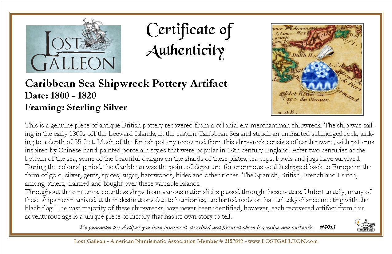 This is a genuine piece of antique British pottery recovered from a colonial era merchantman shipwreck. The ship was sailing in the early 1800s off the Leeward Islands, in the eastern Caribbean Sea and struck an uncharted submerged rock, sinking to a depth of 55 feet. Much of the British pottery recovered from this shipwreck consists of earthenware, with patterns inspired by Chinese hand-painted porcelain styles that were popular in 18th century England. After two centuries at the bottom of the sea, some of the beautiful designs on the shards of these plates, tea cups, bowls and jugs have survived.