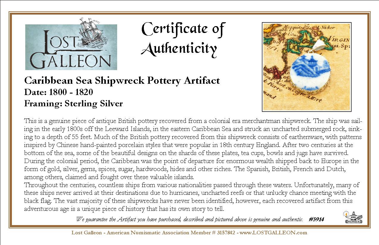 This is a genuine piece of antique British pottery recovered from a colonial era merchantman shipwreck. The ship was sailing in the early 1800s off the Leeward Islands, in the eastern Caribbean Sea and struck an uncharted submerged rock, sinking to a depth of 55 feet. Much of the British pottery recovered from this shipwreck consists of earthenware, with patterns inspired by Chinese hand-painted porcelain styles that were popular in 18th century England. After two centuries at the bottom of the sea, some of the beautiful designs on the shards of these plates, tea cups, bowls and jugs have survived.