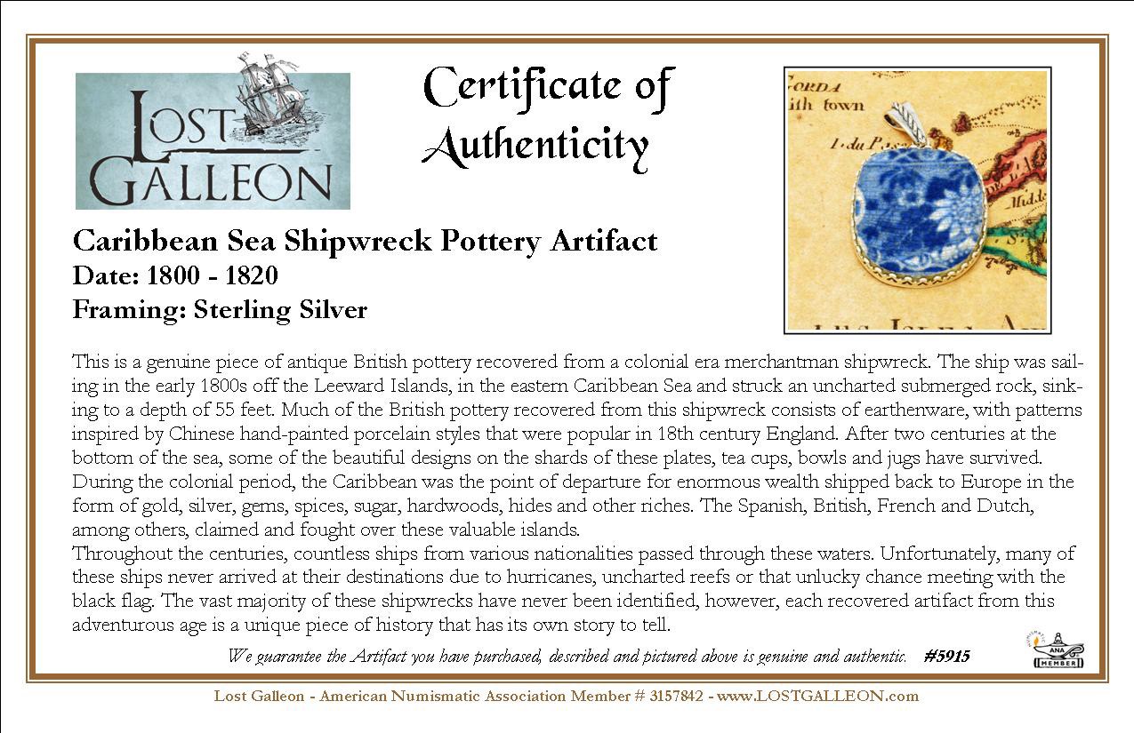 This is a genuine piece of antique British pottery recovered from a colonial era merchantman shipwreck. The ship was sailing in the early 1800s off the Leeward Islands, in the eastern Caribbean Sea and struck an uncharted submerged rock, sinking to a depth of 55 feet. Much of the British pottery recovered from this shipwreck consists of earthenware, with patterns inspired by Chinese hand-painted porcelain styles that were popular in 18th century England. After two centuries at the bottom of the sea, some of the beautiful designs on the shards of these plates, tea cups, bowls and jugs have survived.