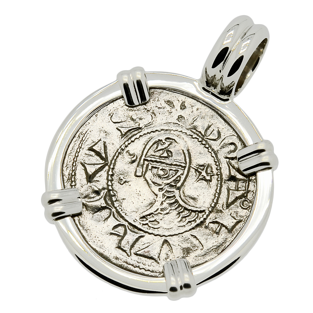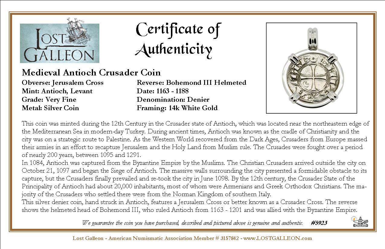 This silver denier coin, hand struck in Antioch, features a Jerusalem Cross or better known as a Crusader Cross. The reverse shows the helmeted head of Bohemond III, who ruled Antioch from 1163 - 1201 and was allied with the Byzantine Empire.
