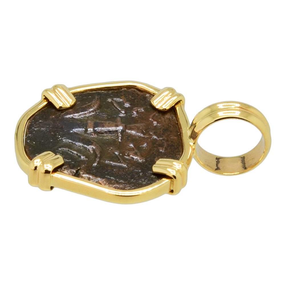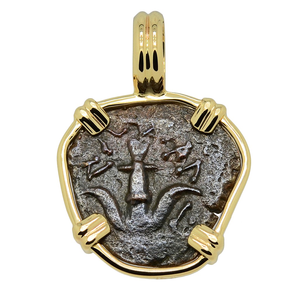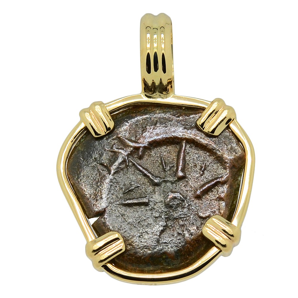 These small bronze coins called prutah, were minted in Judaea during the first century BC and were common currency used during the time of Christ. There is an anchor on one side and a star on the reverse. A loaf of bread during this time was worth about ten prutah coins.