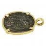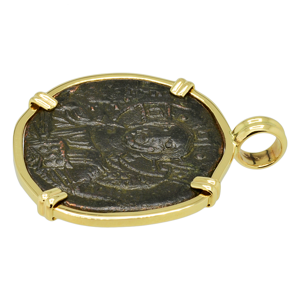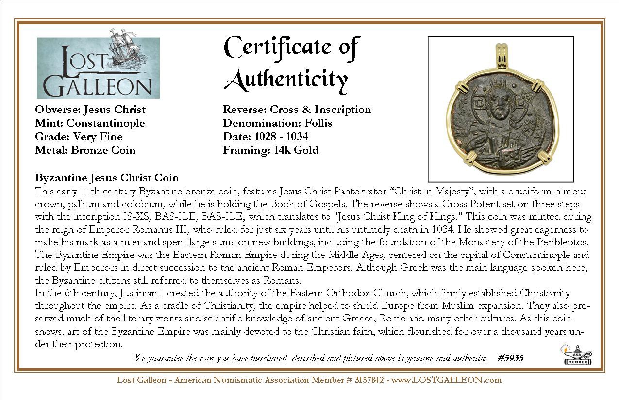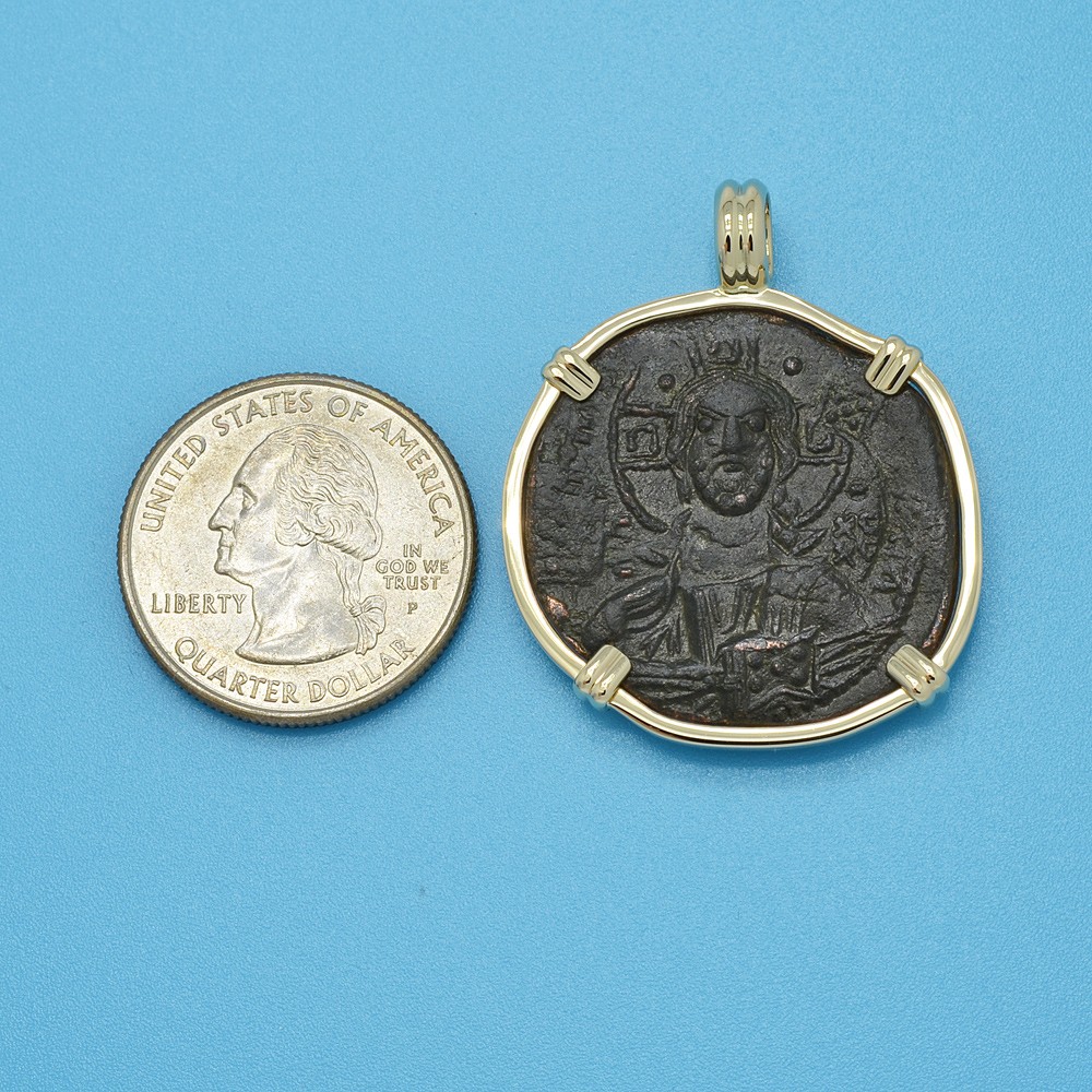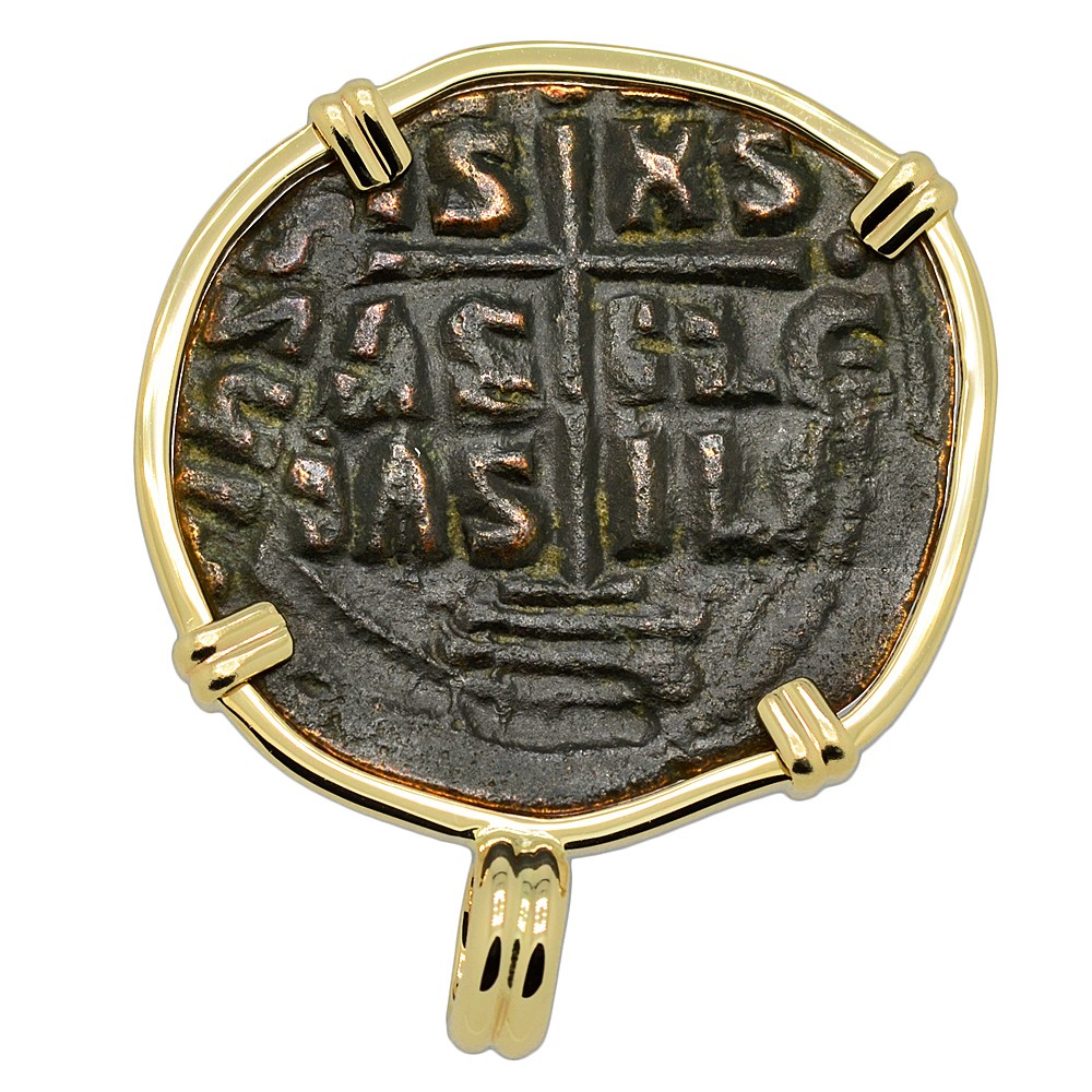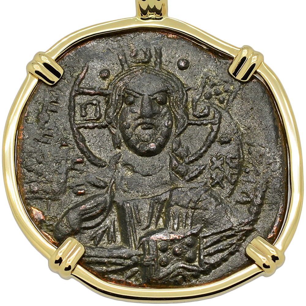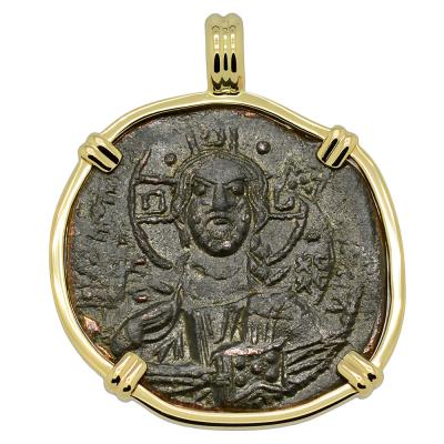 This early 11th century Byzantine bronze coin, features Jesus Christ Pantokrator “Christ in Majesty”, with a cruciform nimbus crown, pallium and colobium, while he is holding the Book of Gospels. The reverse shows a Cross Potent set on three steps with the inscription IS-XS, BAS-ILE, BAS-ILE, which translates to "Jesus Christ King of Kings." This coin was minted during the reign of Emperor Romanus III, who ruled for just six years until his untimely death in 1034. He showed great eagerness to make his mark as a ruler and spent large sums on new buildings, including the foundation of the Monastery of the Peribleptos.