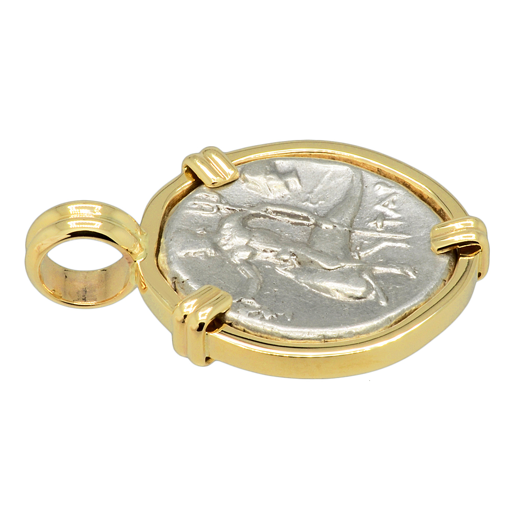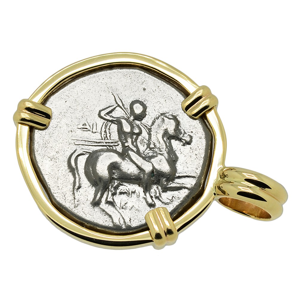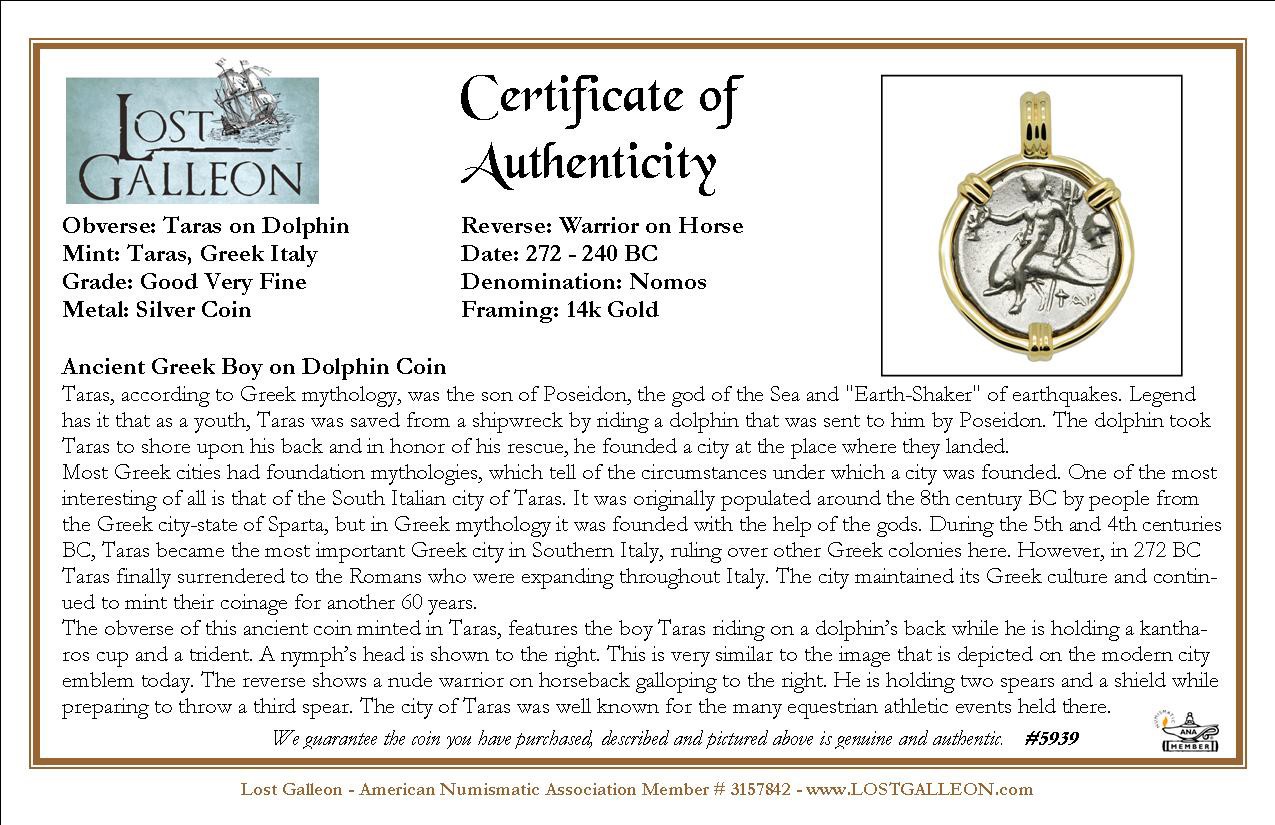 The obverse of this ancient coin minted in Taras, features the boy Taras riding on a dolphin’s back while he is holding a kantharos cup and a trident. A nymph’s head is shown to the right. This is very similar to the image that is depicted on the modern city emblem today. The reverse shows a nude warrior on horseback galloping to the right. He is holding two spears and a shield while preparing to throw a third spear. The city of Taras was well known for the many equestrian athletic events held there.