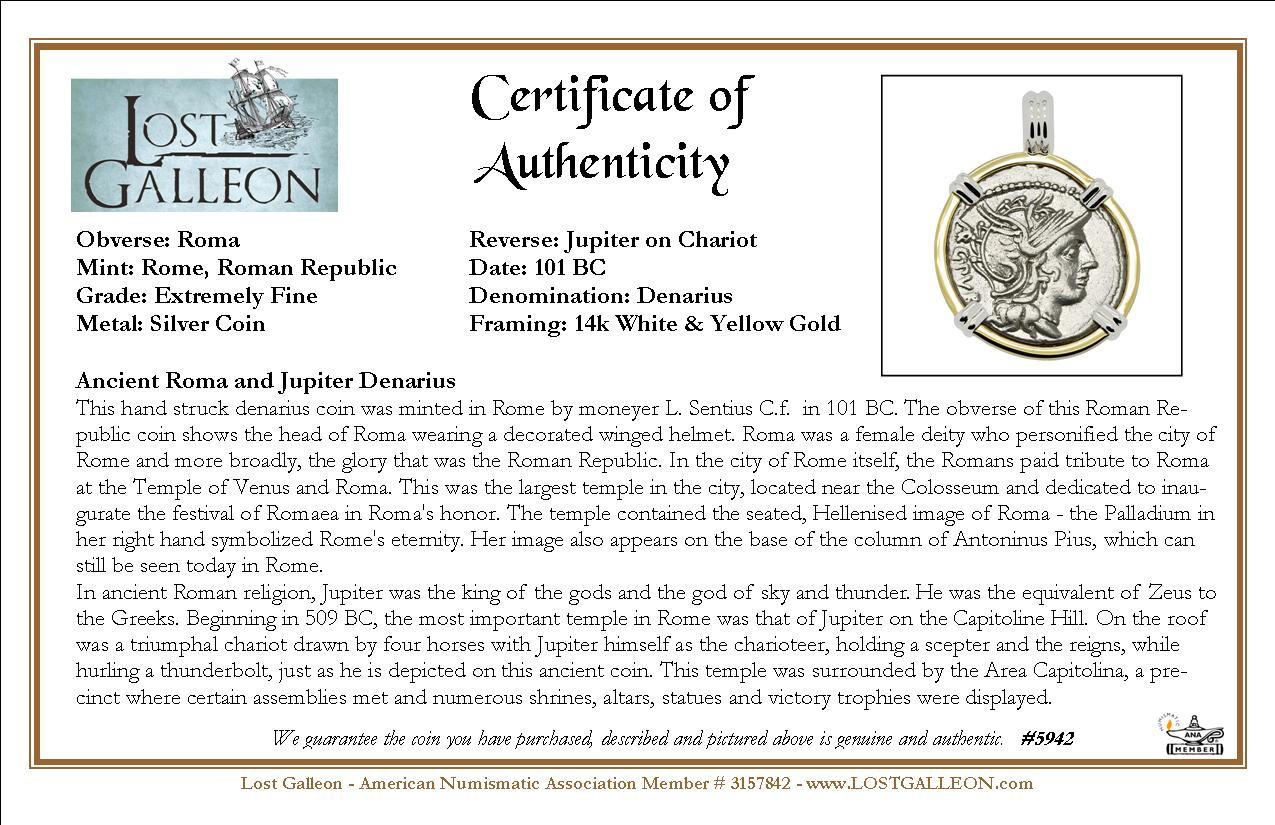 This hand struck denarius coin was minted in Rome by moneyer L. Sentius C.f. in 101 BC. The obverse of this Roman Republic coin shows the head of Roma wearing a decorated winged helmet. Roma was a female deity who personified the city of Rome and more broadly, the glory that was the Roman Republic. In the city of Rome itself, the Romans paid tribute to Roma at the Temple of Venus and Roma. This was the largest temple in the city, located near the Colosseum and dedicated to inaugurate the festival of Romaea in Roma's honor. The temple contained the seated, Hellenised image of Roma - the Palladium in her right hand symbolized Rome's eternity. Her image also appears on the base of the column of Antoninus Pius, which can still be seen today in Rome.