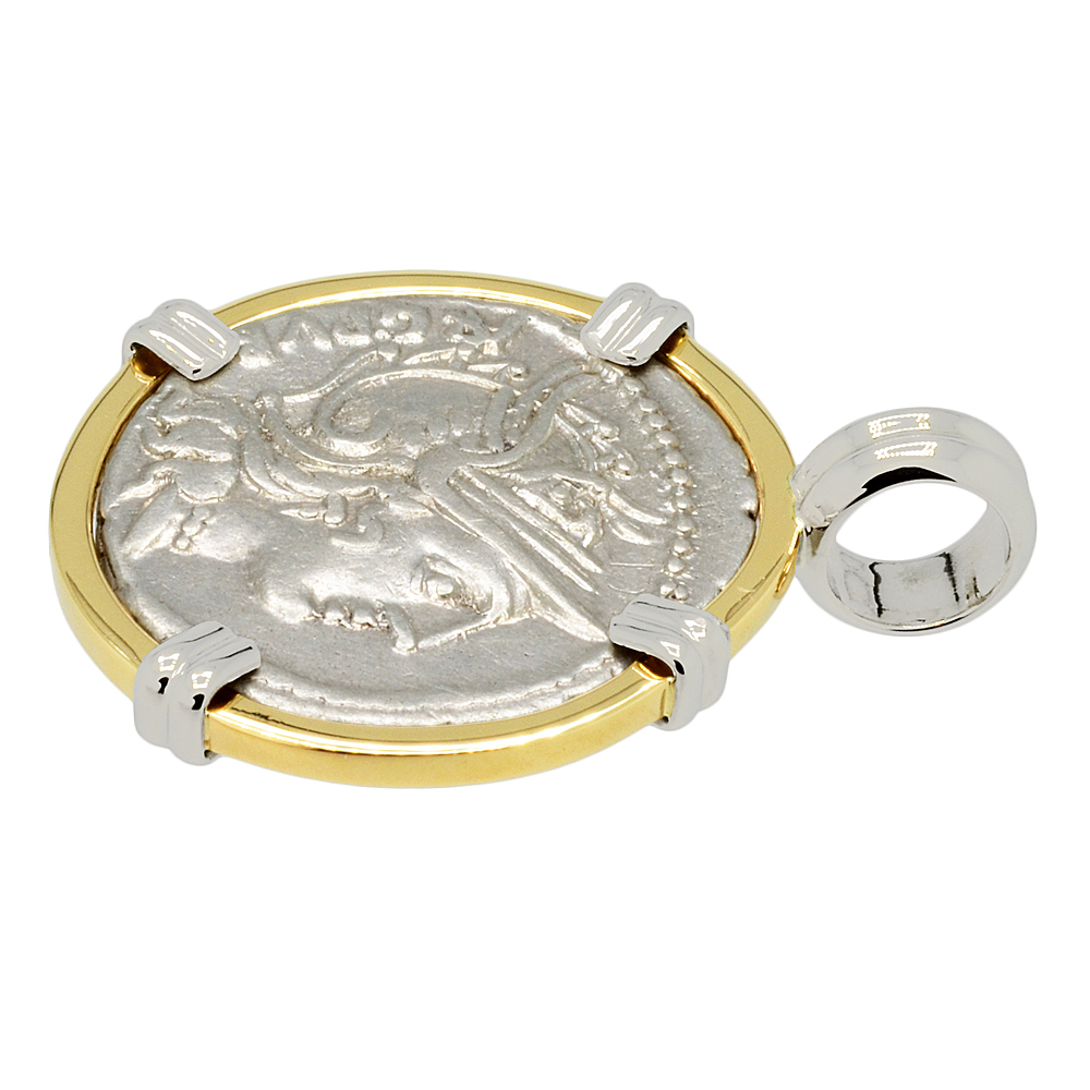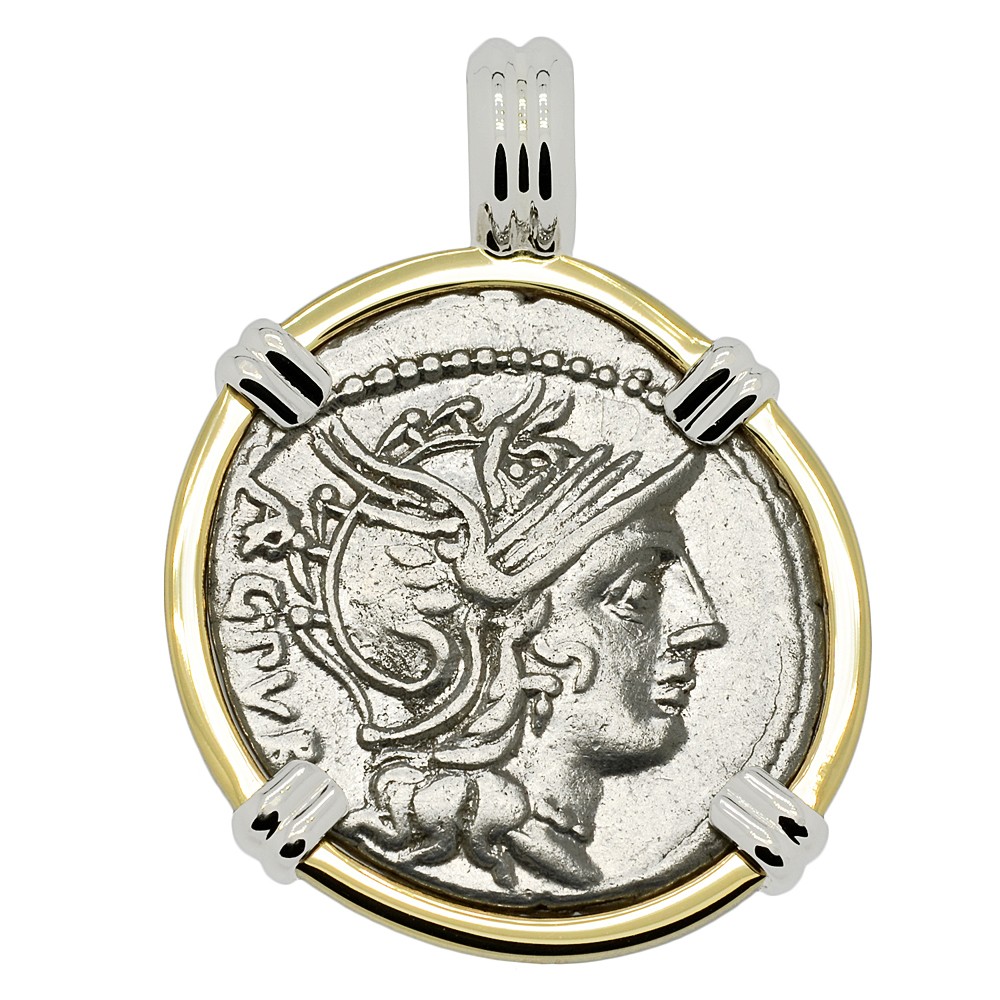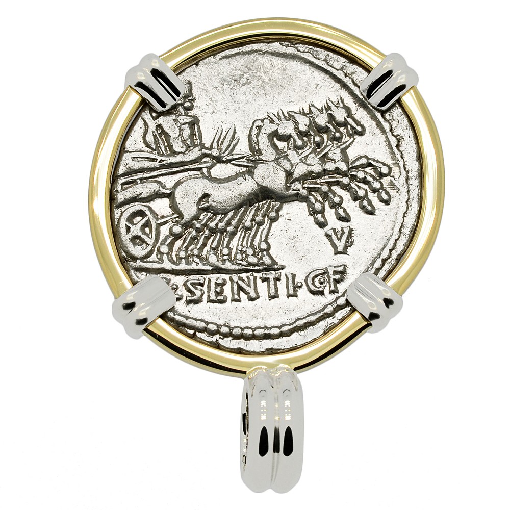 In ancient Roman religion, Jupiter was the king of the gods and the god of sky and thunder. He was the equivalent of Zeus to the Greeks. Beginning in 509 BC, the most important temple in Rome was that of Jupiter on the Capitoline Hill. On the roof was a triumphal chariot drawn by four horses with Jupiter himself as the charioteer, holding a scepter and the reigns, while hurling a thunderbolt, just as he is depicted on this ancient coin. This temple was surrounded by the Area Capitolina, a precinct where certain assemblies met and numerous shrines, altars, statues and victory trophies were displayed.