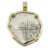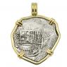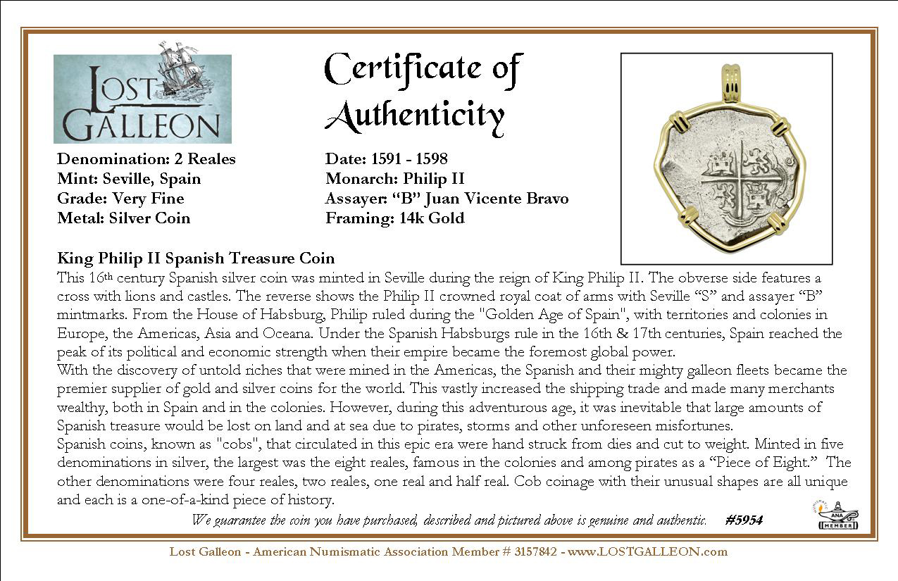 This 16th century Spanish silver coin was minted in Seville during the reign of King Philip II. The obverse side features a cross with lions and castles. The reverse shows the Philip II crowned royal coat of arms with Seville “S” and assayer “B” mintmarks. From the House of Habsburg, Philip ruled during the "Golden Age of Spain", with territories and colonies in Europe, the Americas, Asia and Oceana. Under the Spanish Habsburgs rule in the 16th & 17th centuries, Spain reached the peak of its political and economic strength when their empire became the foremost global power.