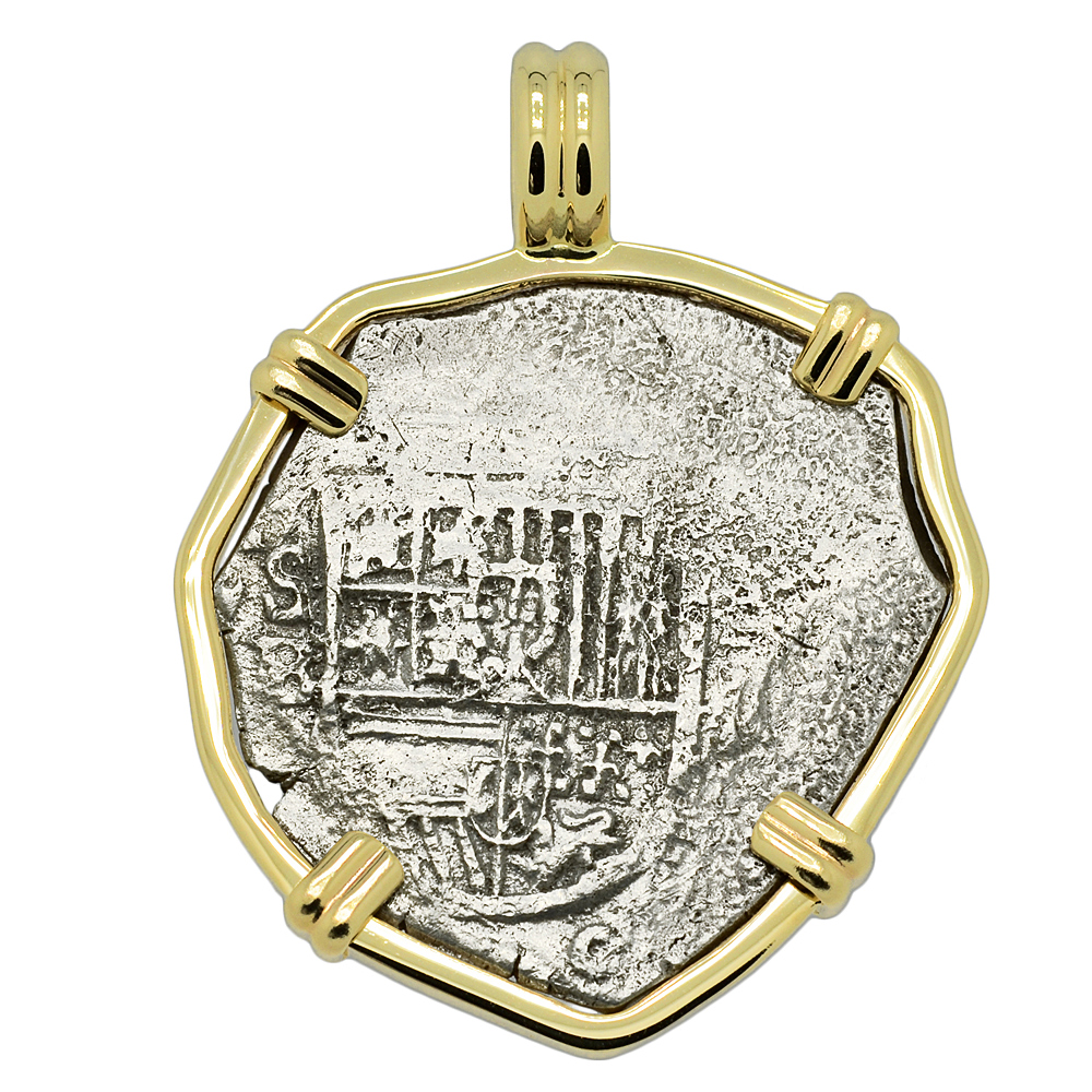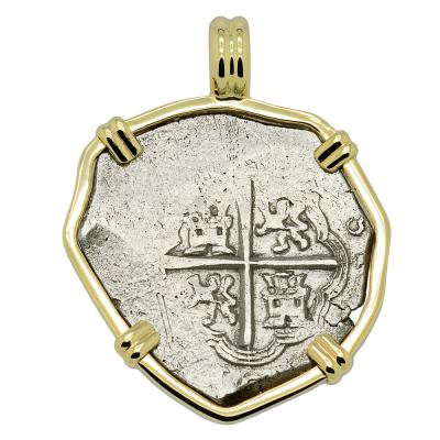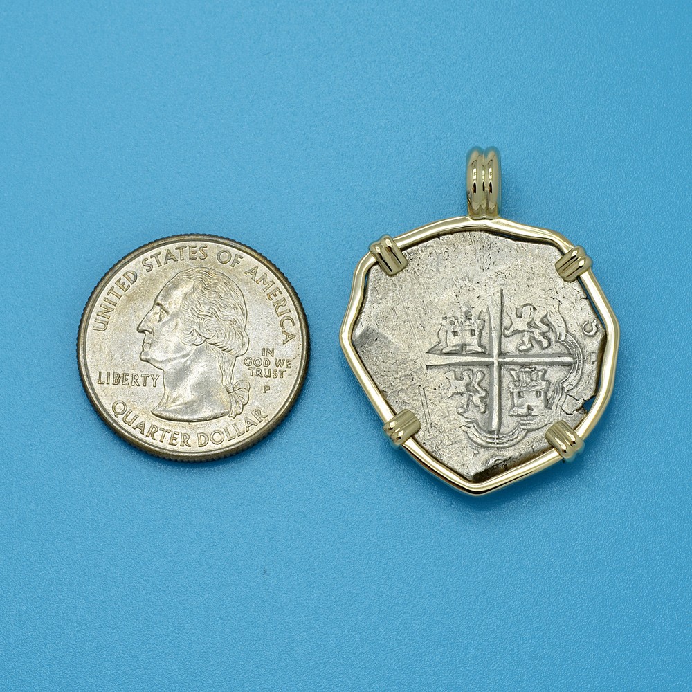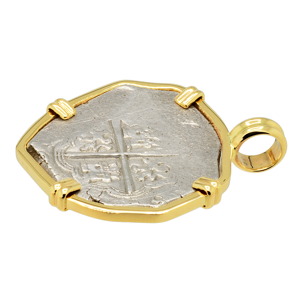 Spanish coins, known as "cobs", that circulated in this epic era were hand struck from dies and cut to weight. Minted in five denominations in silver, the largest was the eight reales, famous in the colonies and among pirates as a “Piece of Eight.” The other denominations were four reales, two reales, one real and half real. Cob coinage with their unusual shapes are all unique and each is a one-of-a-kind piece of history.