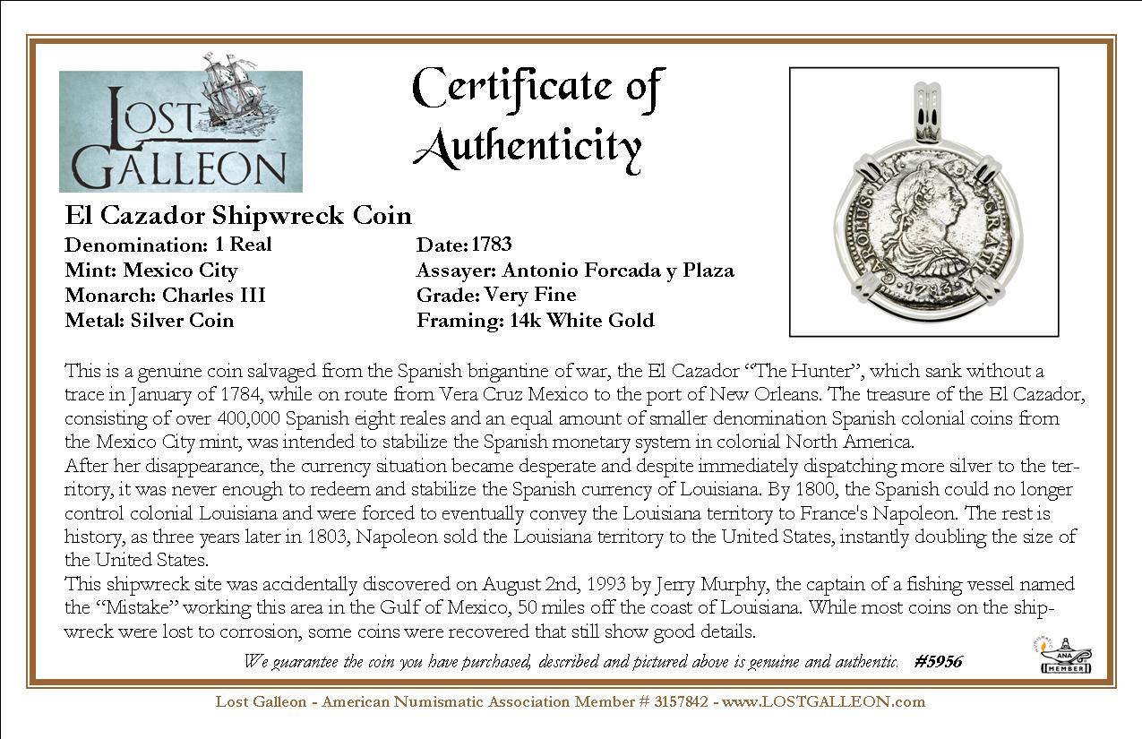 El Cazador shipwreck coin certificate also included. This is a genuine coin salvaged from the Spanish brigantine of war, the El Cazador “The Hunter”, which sank without a trace in January of 1784, while on route from Vera Cruz Mexico to the port of New Orleans. The treasure of the El Cazador, consisting of over 400,000 Spanish eight reales and an equal amount of smaller denomination Spanish colonial coins from the Mexico City mint, was intended to stabilize the Spanish monetary system in colonial North America.