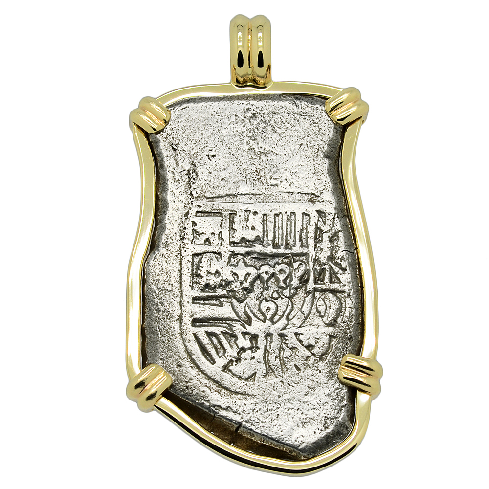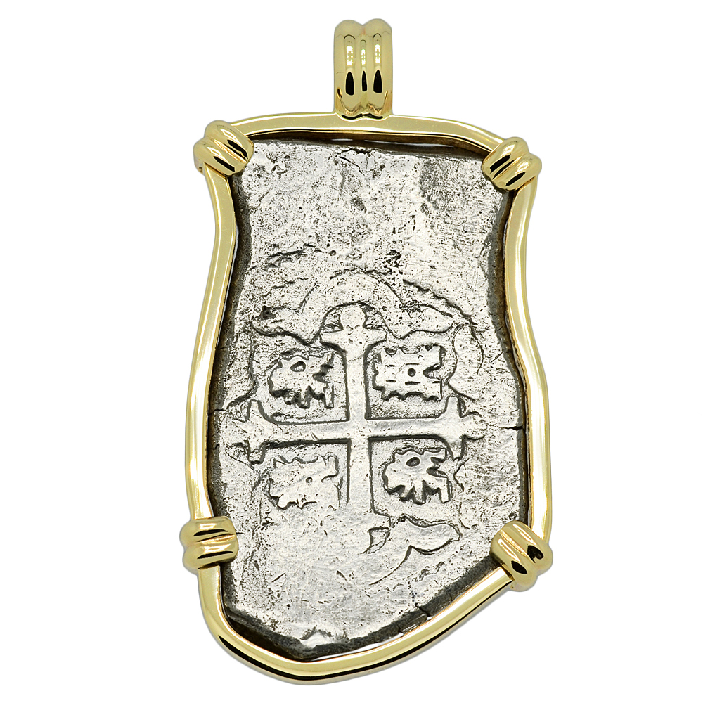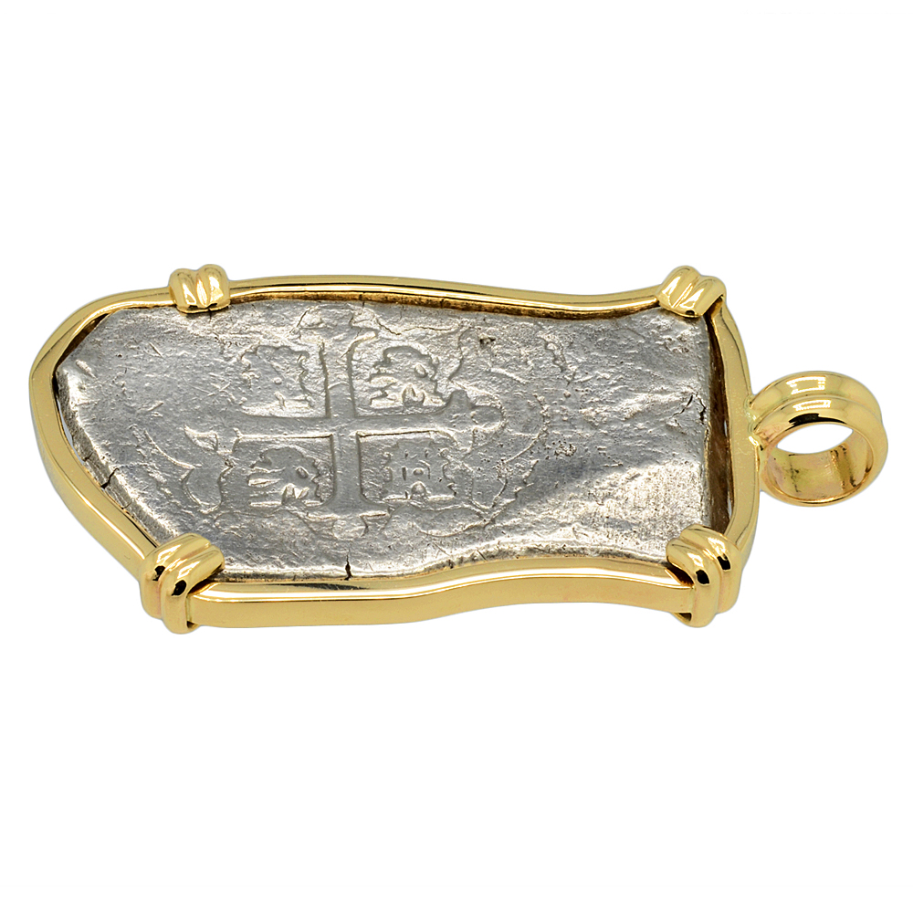 This early 1700s Spanish eight reales coin was recovered from the 1725 Dutch Akerendam shipwreck. The obverse side of this silver “piece of eight” cob coin features a cross with lions and castles in the quarters. The reverse shows the royal coat of arms of Spanish King Philip V.