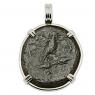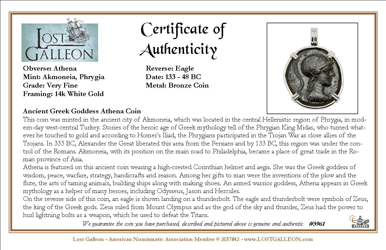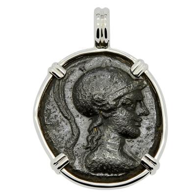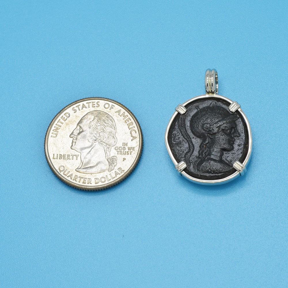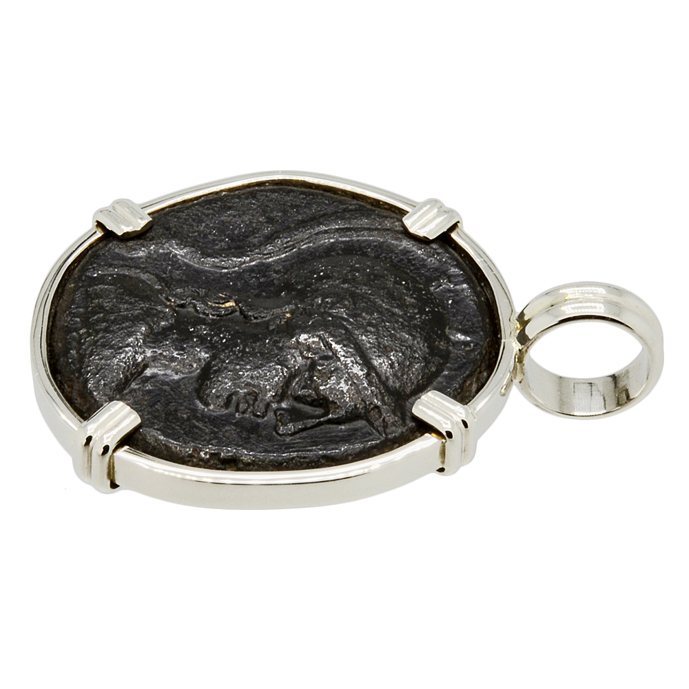 Athena is featured on this ancient coin wearing a high-crested Corinthian helmet and aegis. She was the Greek goddess of wisdom, peace, warfare, strategy, handicrafts and reason. Among her gifts to man were the inventions of the plow and the flute, the arts of taming animals, building ships along with making shoes. An armed warrior goddess, Athena appears in Greek mythology as a helper of many heroes, including Odysseus, Jason and Hercules.