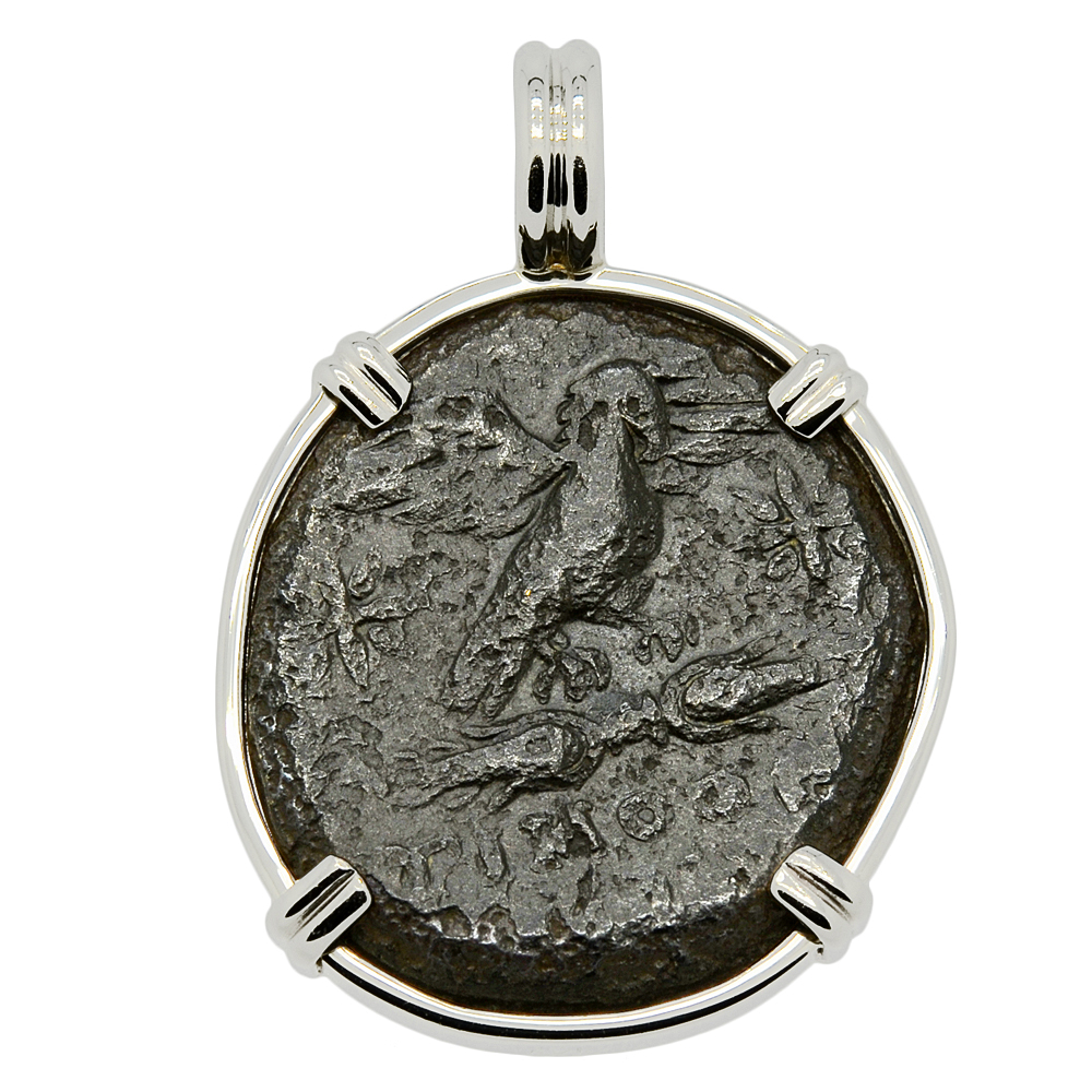 On the reverse side of this coin, an eagle is shown landing on a thunderbolt. The eagle and thunderbolt were symbols of Zeus, the king of the Greek gods. Zeus ruled from Mount Olympus and as the god of the sky and thunder, Zeus had the power to hurl lightning bolts as a weapon, which he used to defeat the Titans.