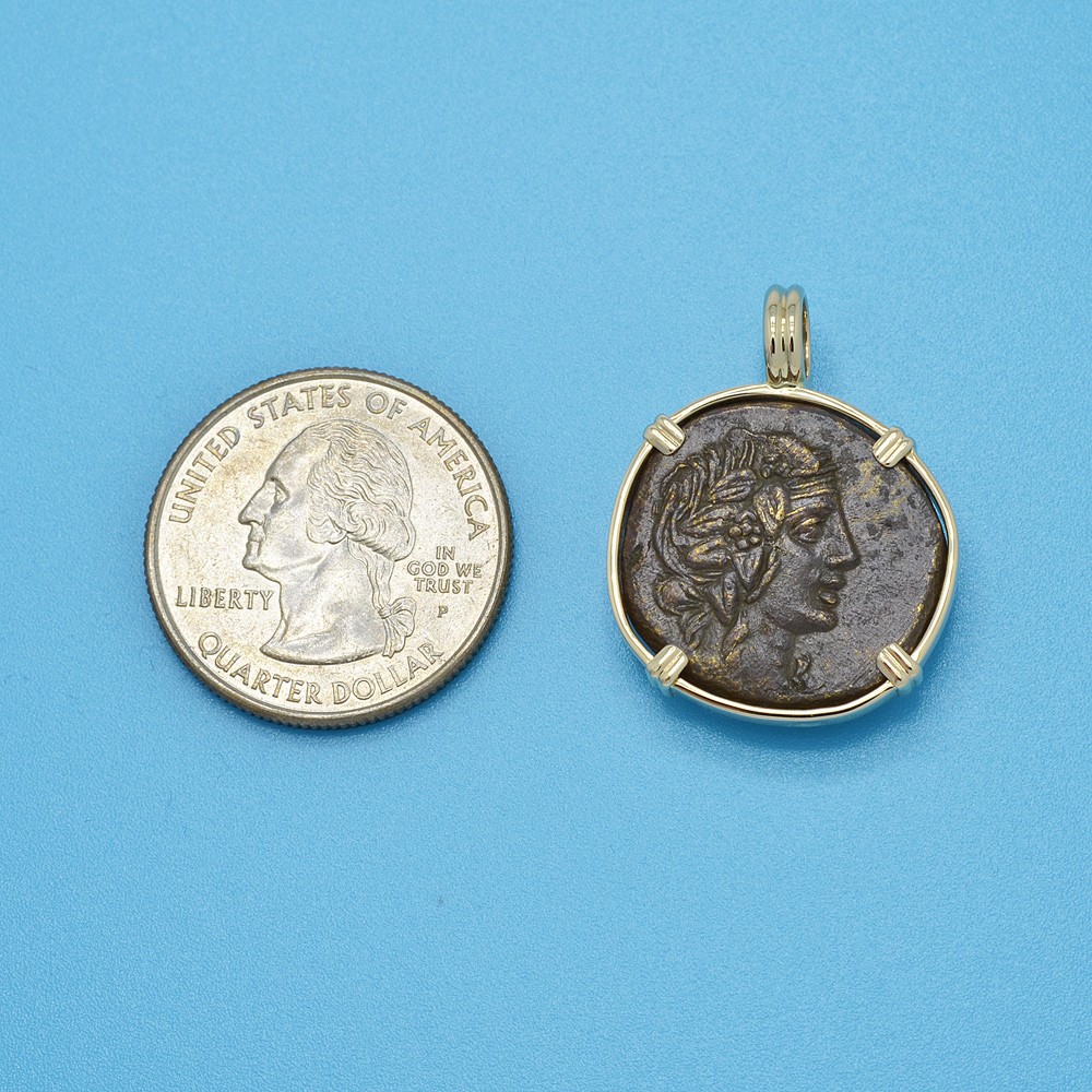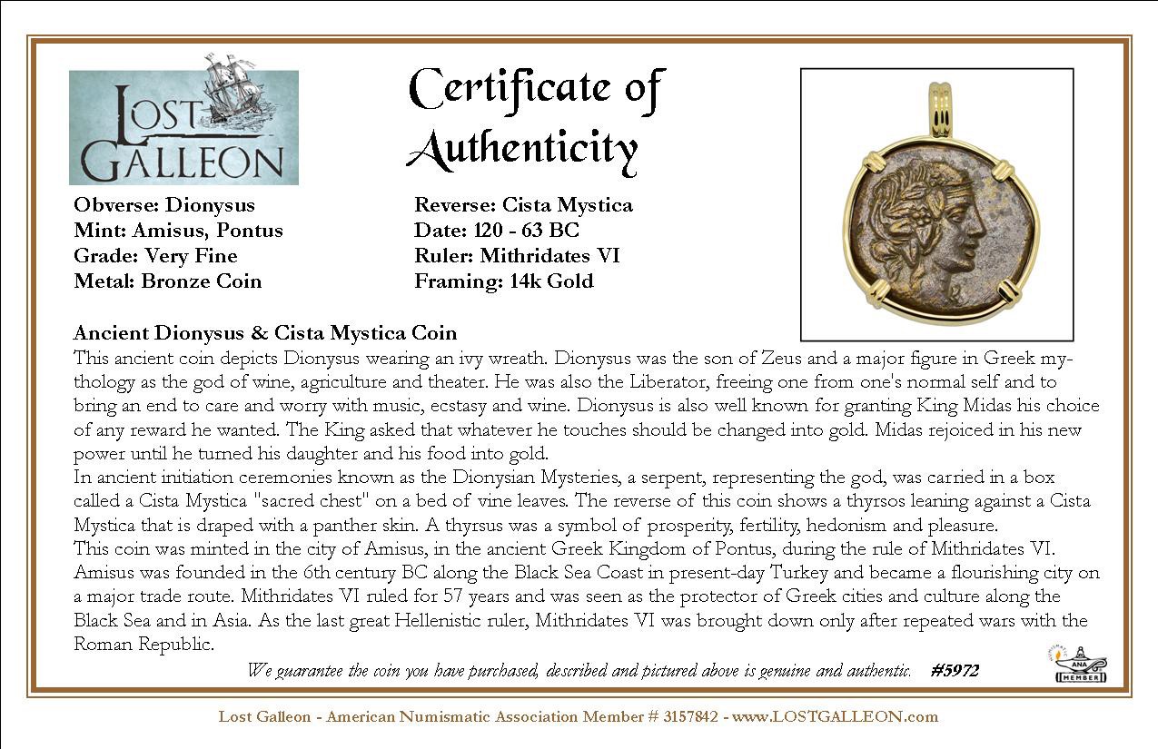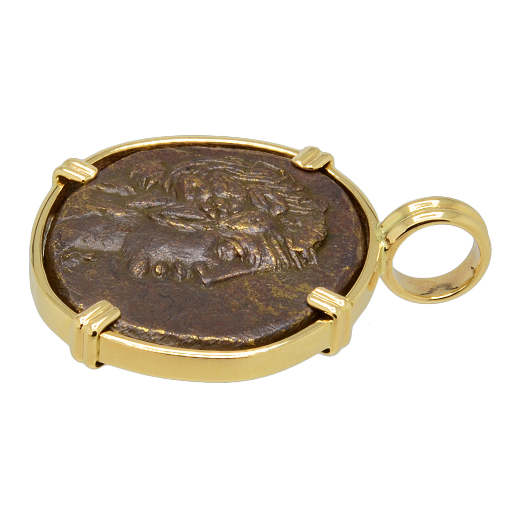 This ancient coin depicts Dionysus wearing an ivy wreath. Dionysus was the son of Zeus and a major figure in Greek mythology as the god of wine, agriculture and theater. He was also the Liberator, freeing one from one's normal self and to bring an end to care and worry with music, ecstasy and wine. Dionysus is also well known for granting King Midas his choice of any reward he wanted. The King asked that whatever he touches should be changed into gold. Midas rejoiced in his new power until he turned his daughter and his food into gold.