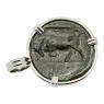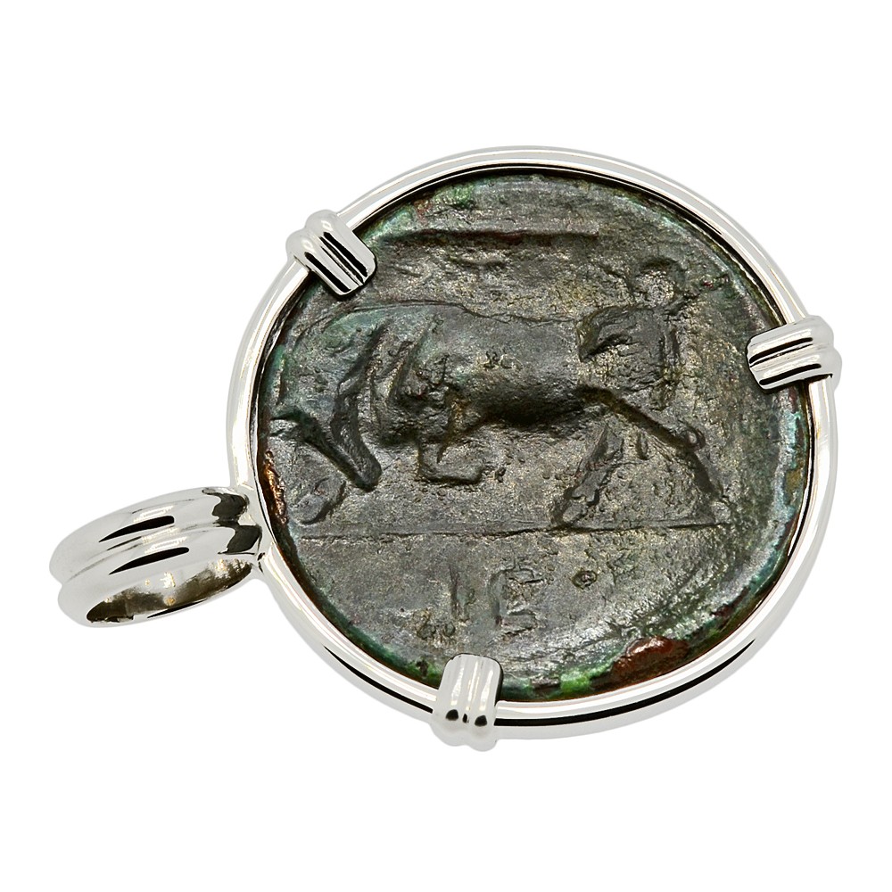 This coin features Persephone, a vegetation goddess associated with the spring season. The reverse side shows a bull charging with a club above. Persephone was the daughter of Zeus and Demeter, the harvest goddess, who controlled the seasons.