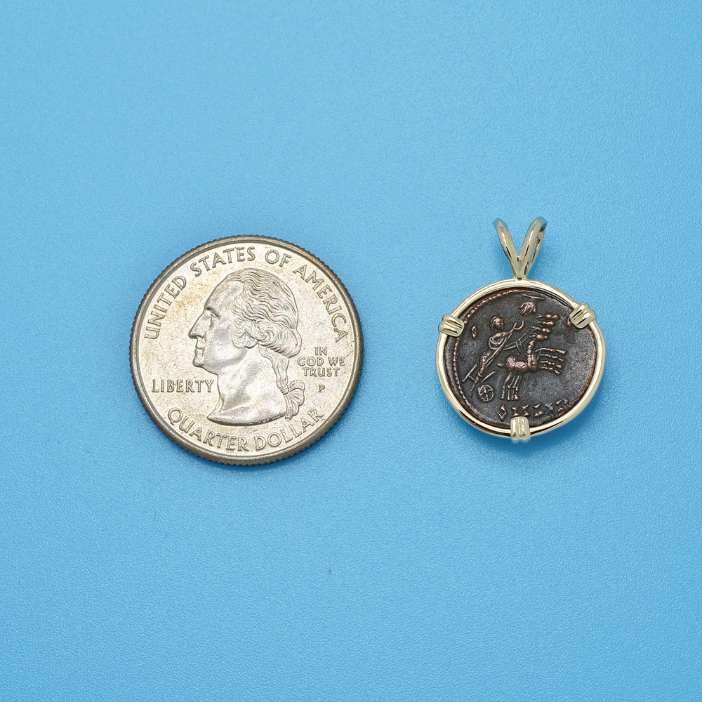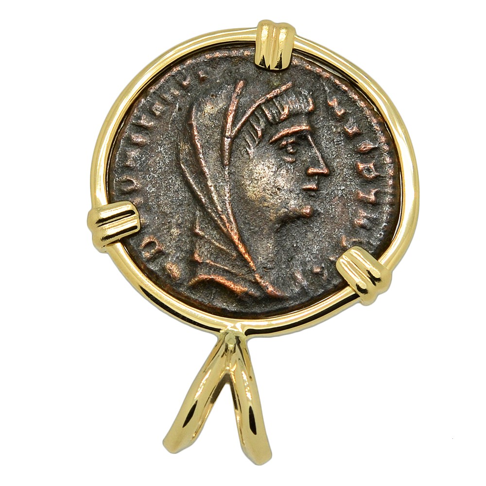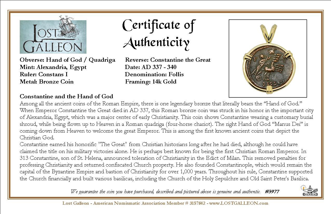 Among all the ancient coins of the Roman Empire, there is one legendary bronze that literally bears the “Hand of God.” When Emperor Constantine the Great died in AD 337, this Roman bronze coin was struck in his honor in the important city of Alexandria, Egypt, which was a major center of early Christianity. This coin shows Constantine wearing a customary burial shroud, while being flown up to Heaven in a Roman quadriga (four-horse chariot). The right Hand of God “Manus Dei” is coming down from Heaven to welcome the great Emperor. This is among the first known ancient coins that depict the Christian God.