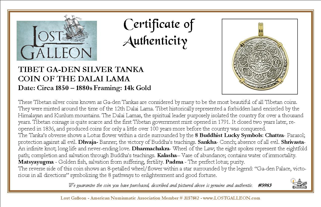 These Tibetan silver coins known as Ga-den Tankas are considered by many to be the most beautiful of all Tibetan coins. They were minted around the time of the 12th Dalai Lama. Tibet historically represented a forbidden land encircled by the Himalayan and Kunlum mountains. The Dalai Lamas, the spiritual leader purposely isolated the country for over a thousand years. Tibetan coinage is quite scarce and the first Tibetan government mint opened in 1791. It closed two years later, re-opened in 1836, and produced coins for only a little over 100 years more before the country was conquered.