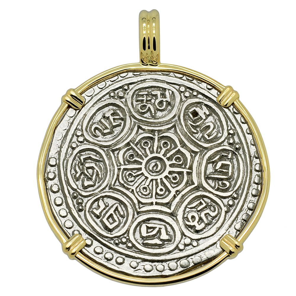 The Tanka’s obverse shows a Lotus flower within a circle surrounded by the 8 Buddhist Lucky Symbols: Chattra- Parasol; protection against all evil. Dhvaja- Banner; the victory of Buddha's teachings. Sankha- Conch; absence of all evil. Shrivasta- An infinite knot; long life and never-ending love. Dharmachakra- Wheel of the Law; the eight spokes represent the eightfold path; completion and salvation through Buddha's teachings. Kalasha– Vase of abundance; contains water of immortality. Matsyayugma - Golden fish, salvation from suffering, fertility. Padma - The perfect lotus; purity.