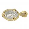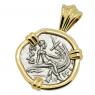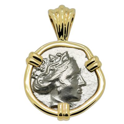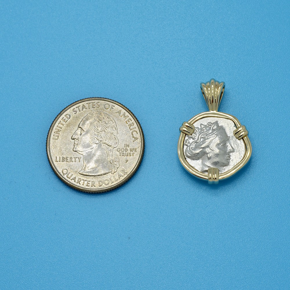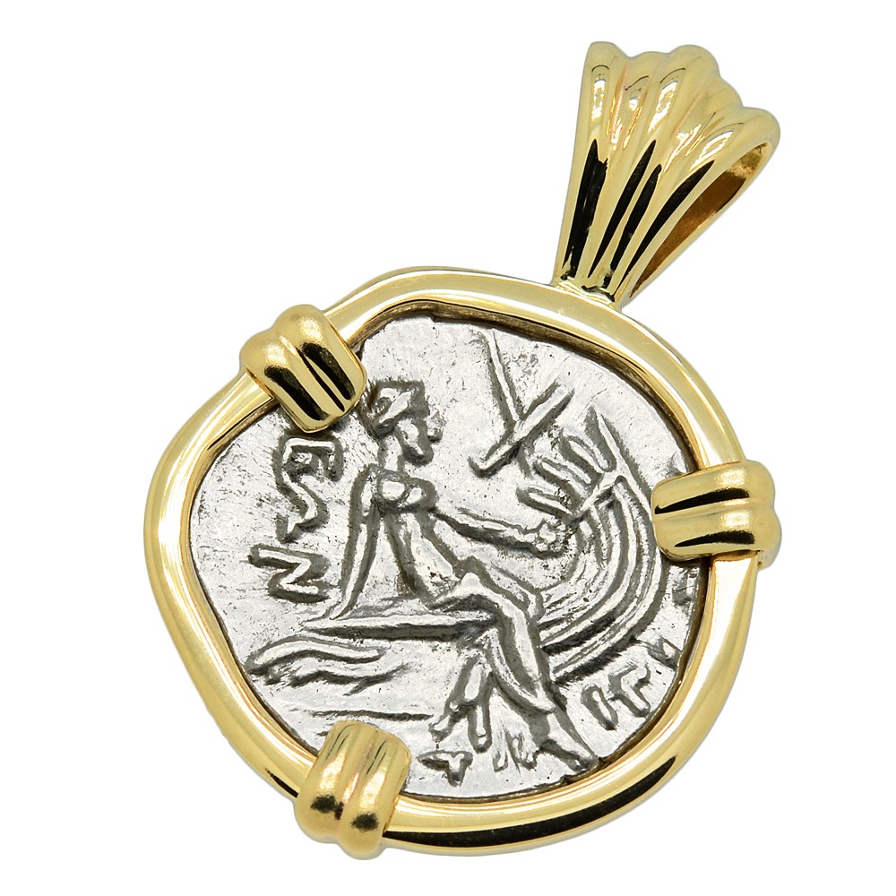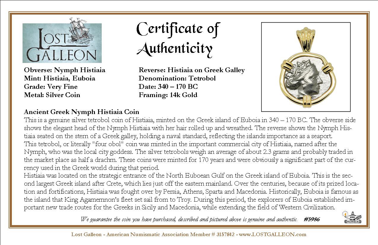 This is a genuine silver tetrobol coin of Histiaia, minted on the Greek island of Euboia in 340 – 170 BC. The obverse side shows the elegant head of the Nymph Histiaia with her hair rolled up and wreathed. The reverse shows the Nymph Histiaia seated on the stern of a Greek galley, holding a naval standard, reflecting the islands importance as a seaport.
