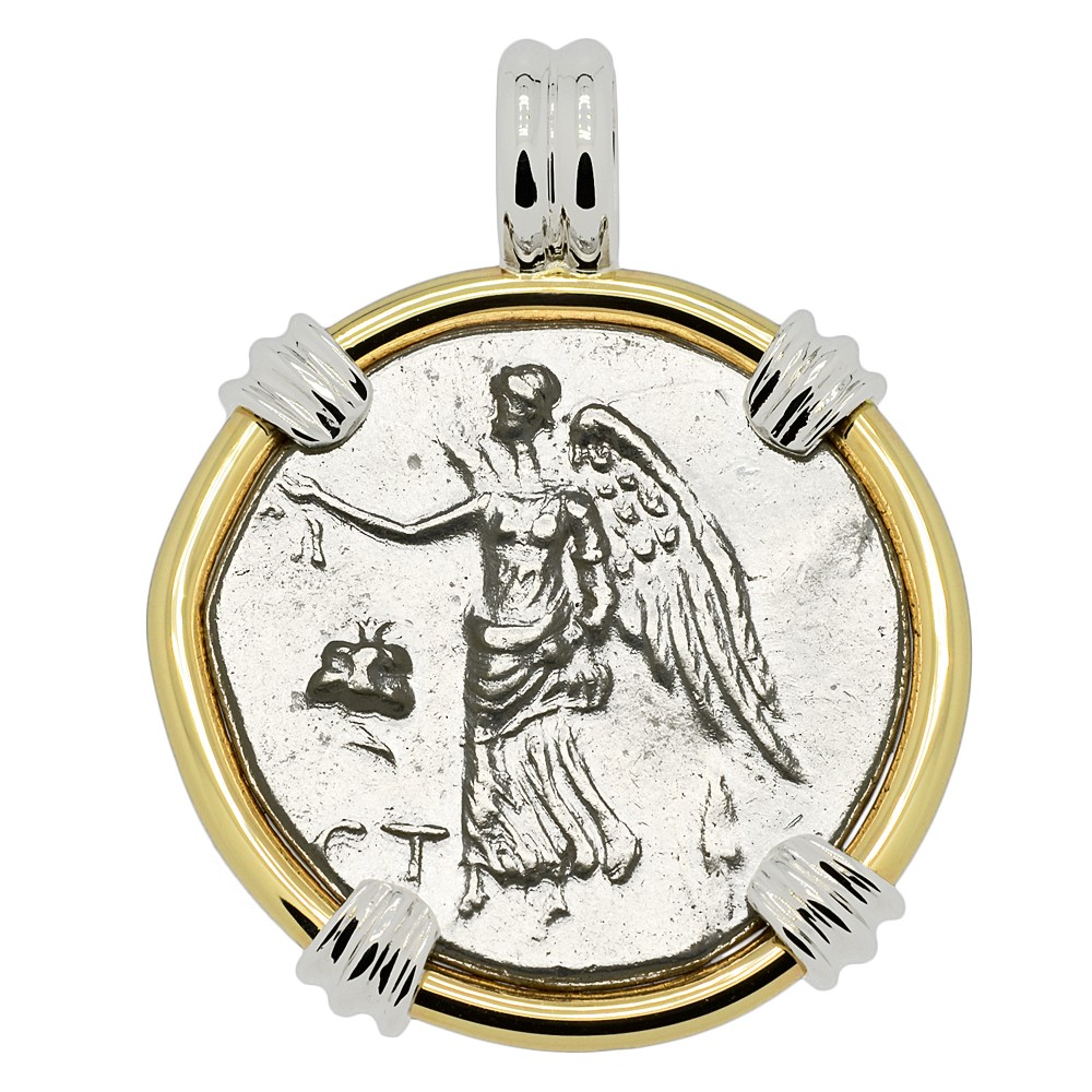 Athena is featured on this ancient coin wearing a crested Corinthian helmet. She was the goddess of wisdom, peace, warfare, strategy and reason. An armed warrior goddess, Athena appears in Greek mythology as a helper of many heroes, including Odysseus, Jason and Hercules. Winged Nike is shown on the reverse side of this coin holding a wreath with a pomegranate shown to the left. She was the goddess who personified triumph throughout the ages of ancient Greek culture. Nike, the goddess of strength, speed and victory would fly around battlefields rewarding the victors with glory and fame.