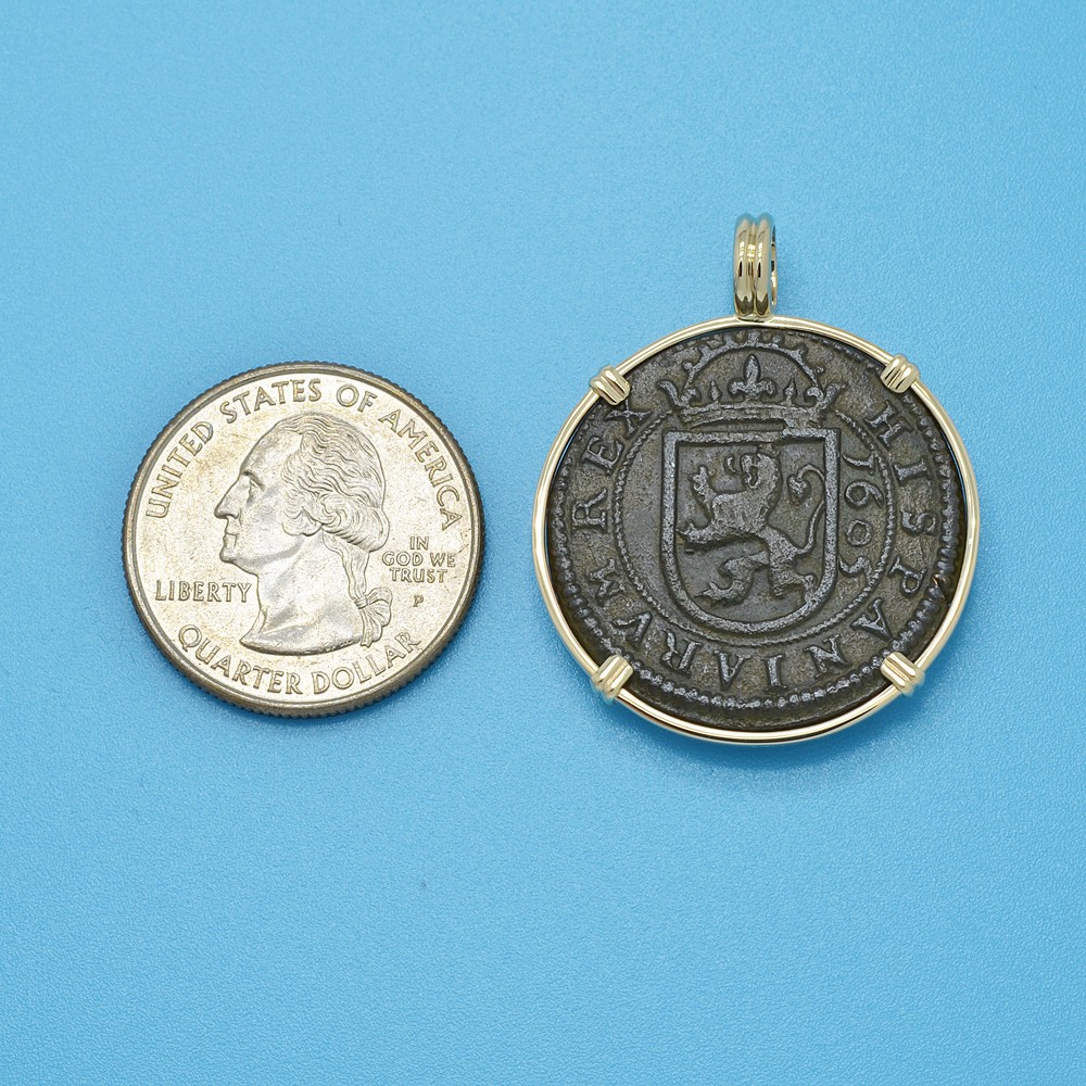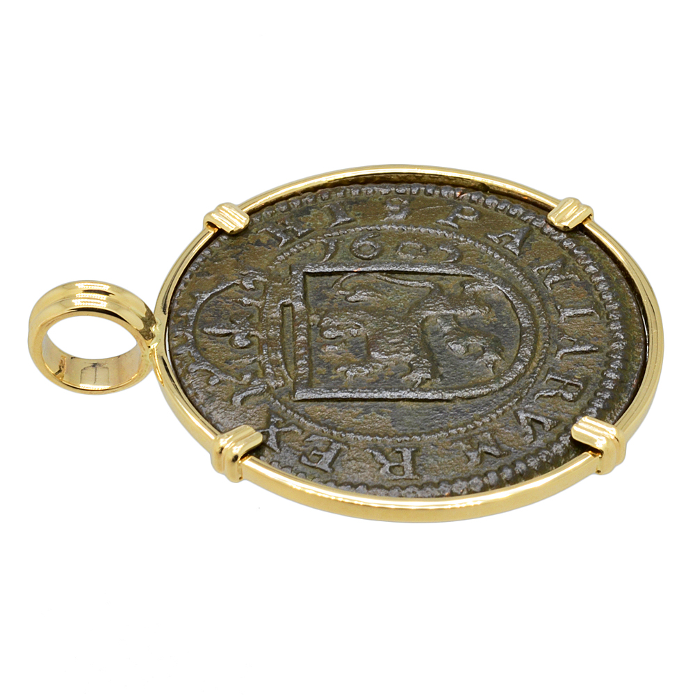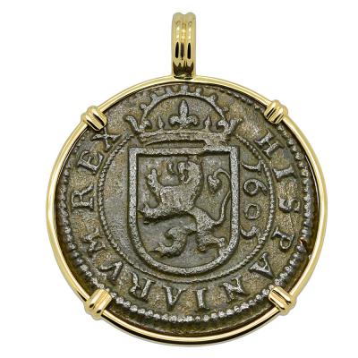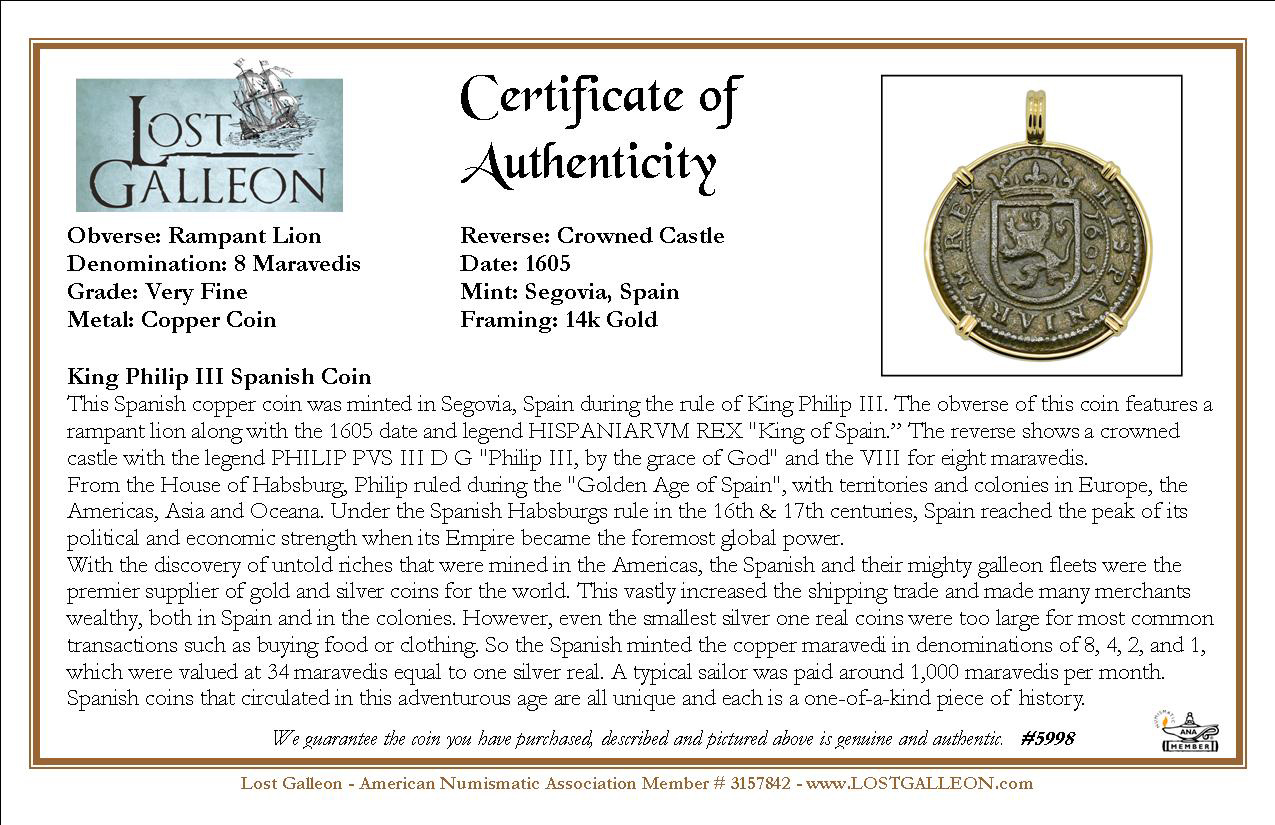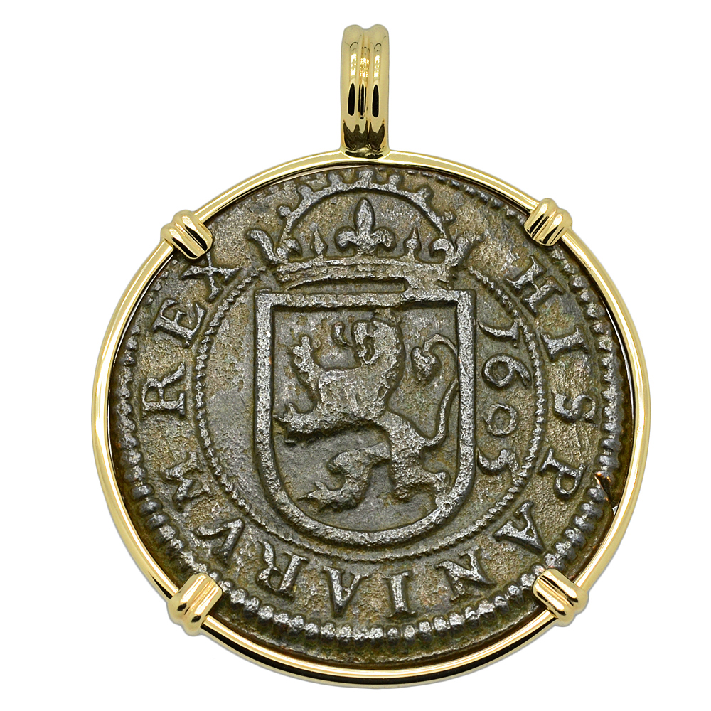 This Spanish copper coin was minted in Segovia, Spain during the rule of King Philip III. The obverse of this coin features a rampant lion along with the 1605 date and legend HISPANIARVM REX "King of Spain.” The reverse shows a crowned castle with the legend PHILIP PVS III D G "Philip III, by the grace of God" and the VIII for eight maravedis.