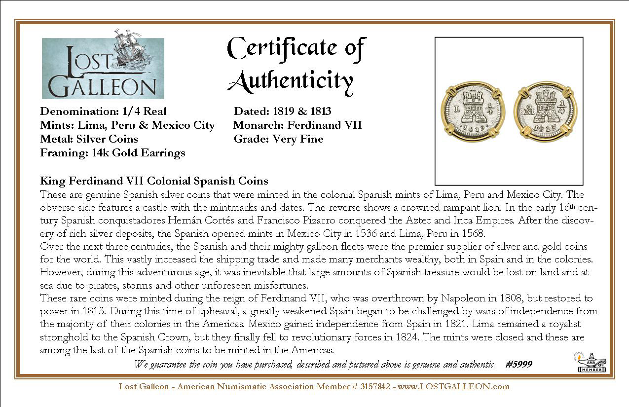 These rare coins were minted during the reign of Ferdinand VII, who was overthrown by Napoleon in 1808, but restored to power in 1813. During this time of upheaval, a greatly weakened Spain began to be challenged by wars of independence from the majority of their colonies in the Americas. Mexico gained independence from Spain in 1821. Lima remained a royalist stronghold to the Spanish Crown, but they finally fell to revolutionary forces in 1824. The mints were closed and these are among the last of the Spanish coins to be minted in the Americas.