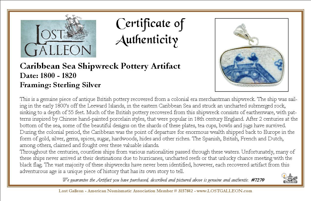 This is a genuine piece of antique British pottery recovered from a colonial era merchantman shipwreck. The ship was sailing in the early 1800’s off the Leeward Islands, in the eastern Caribbean Sea and struck an uncharted submerged rock, sinking to a depth of 55 feet. Much of the British pottery recovered from this shipwreck consists of earthenware, with patterns inspired by Chinese hand-painted porcelain styles, that were popular in 18th century England. After 2 centuries at the bottom of the sea, some of the beautiful designs on the shards of these plates, tea cups, bowls and jugs have survived.