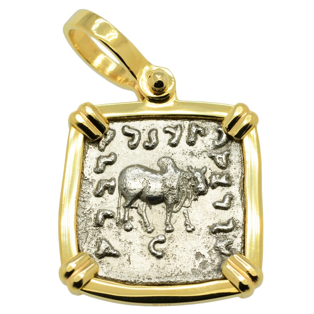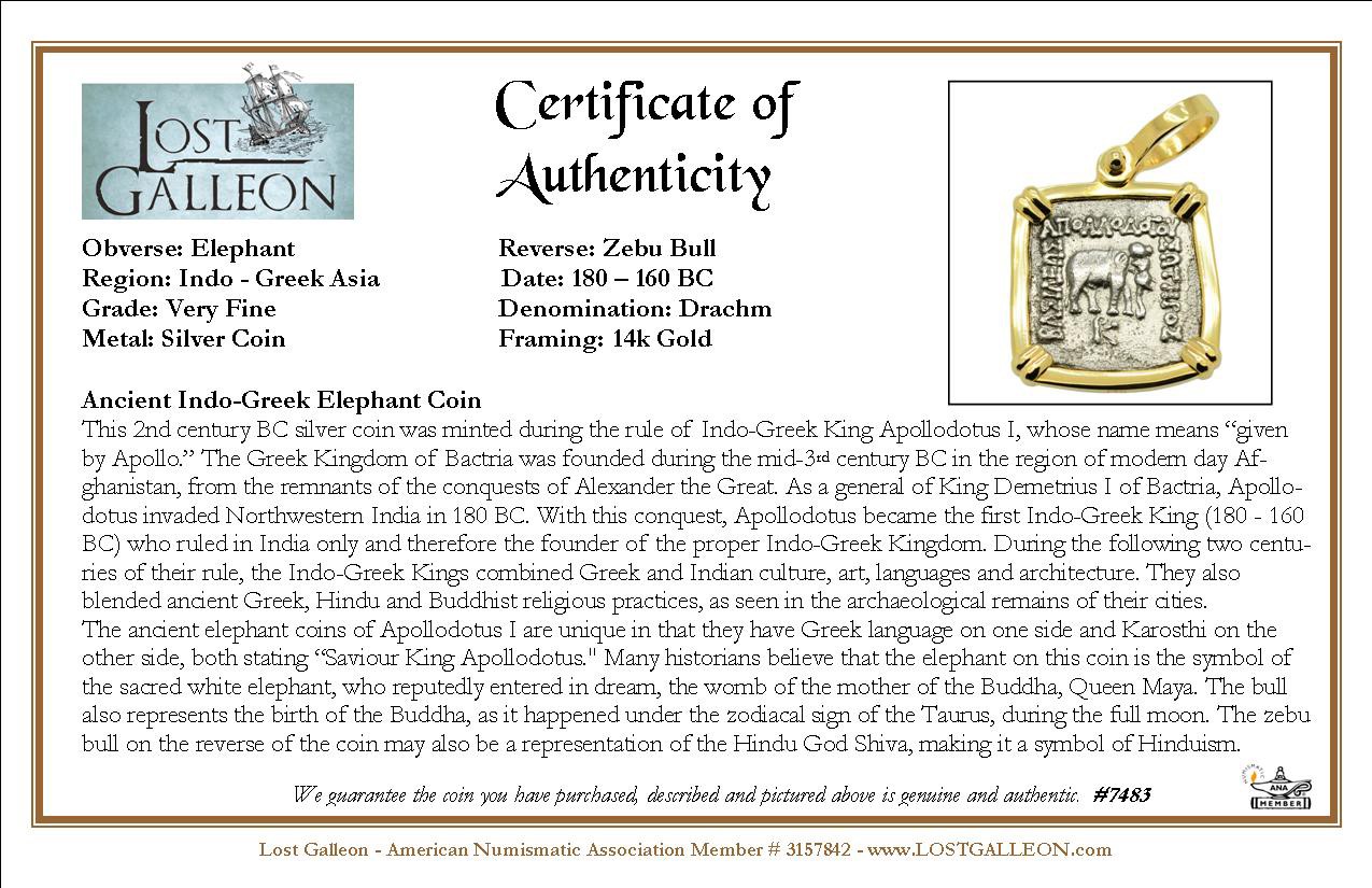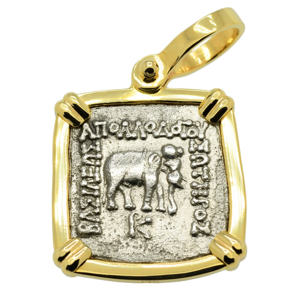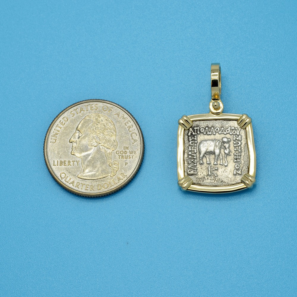 The ancient elephant coins of Apollodotus I are unique in that they have Greek language on one side and Karosthi on the other side, both stating “Saviour King Apollodotus." Many historians believe that the elephant on this coin is the symbol of the sacred white elephant, who reputedly entered in dream, the womb of the mother of the Buddha, Queen Maya. The bull also represents the birth of the Buddha, as it happened under the zodiacal sign of the Taurus, during the full moon. The zebu bull on the reverse of the coin may also be a representation of the Hindu God Shiva, making it a symbol of Hinduism.