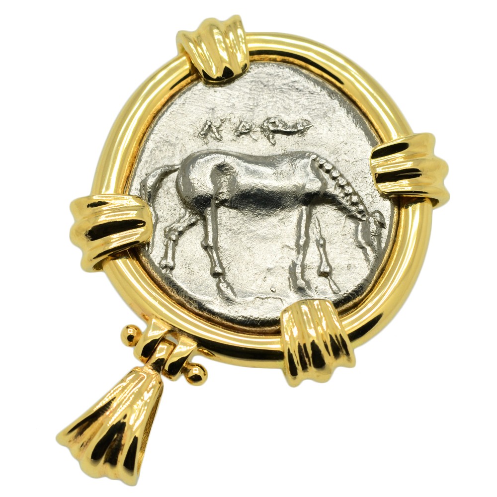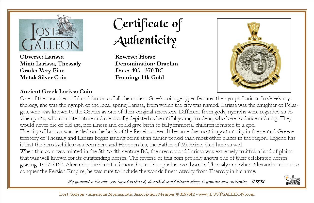 When this coin was minted in the 5th to 4th century BC, the area around Larissa was extremely fruitful, a land of plains that was well known for its outstanding horses. The reverse of this coin proudly shows one of their celebrated horses grazing. In 355 BC, Alexander the Great's famous horse, Bucephalus, was born in Thessaly and when Alexander set out to conquer the Persian Empire, he was sure to include the worlds finest cavalry from Thessaly in his army.