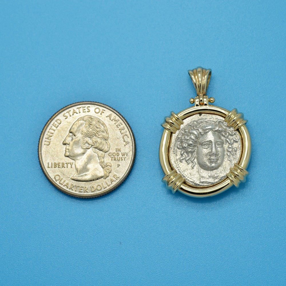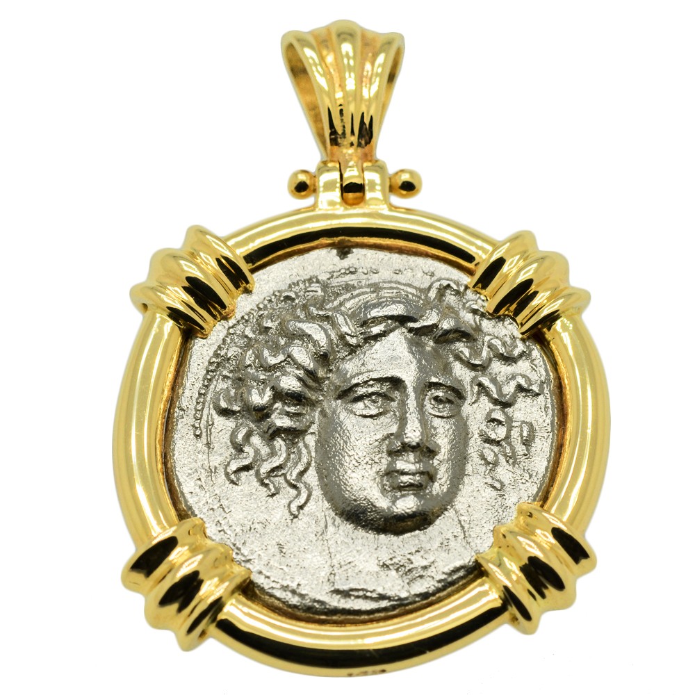 One of the most beautiful and famous of all the ancient Greek coinage types features the nymph Larissa. In Greek mythology, she was the nymph of the local spring Larissa, from which the city was named. Larissa was the daughter of Pelasgus, who was known to the Greeks as one of their original ancestors. Different from gods, nymphs were regarded as divine spirits, who animate nature and are usually depicted as beautiful young maidens, who love to dance and sing. They would never die of old age, nor illness and could give birth to fully immortal children if mated to a god.