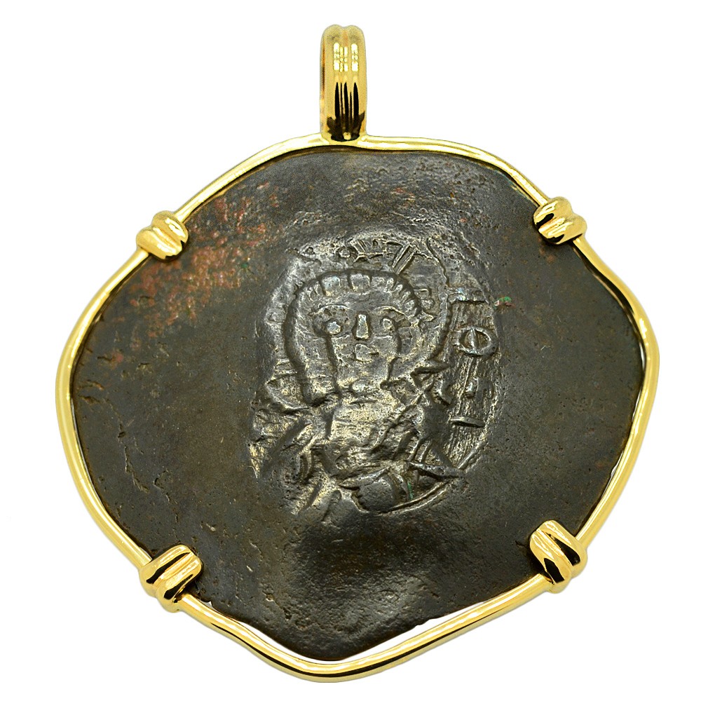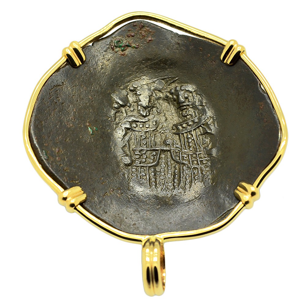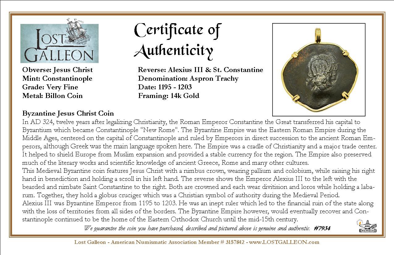 This Medieval Byzantine coin features Jesus Christ with a nimbus crown, wearing pallium and colobium, while raising his right hand in benediction and holding a scroll in his left hand. The reverse shows the Emperor Alexius III to the left with the bearded and nimbate Saint Constantine to the right. Both are crowned and each wear divitision and loros while holding a labarum. Together, they hold a globus cruciger which was a Christian symbol of authority during the Medieval Period.