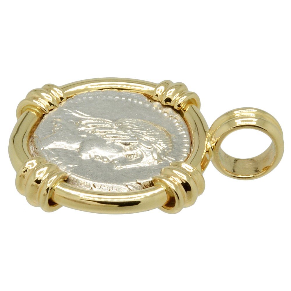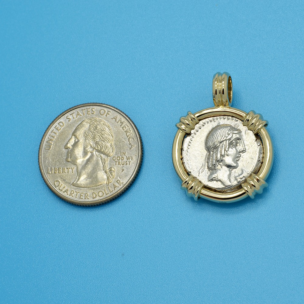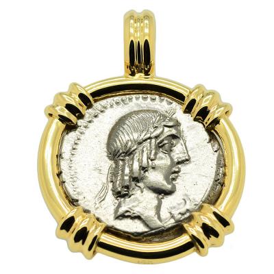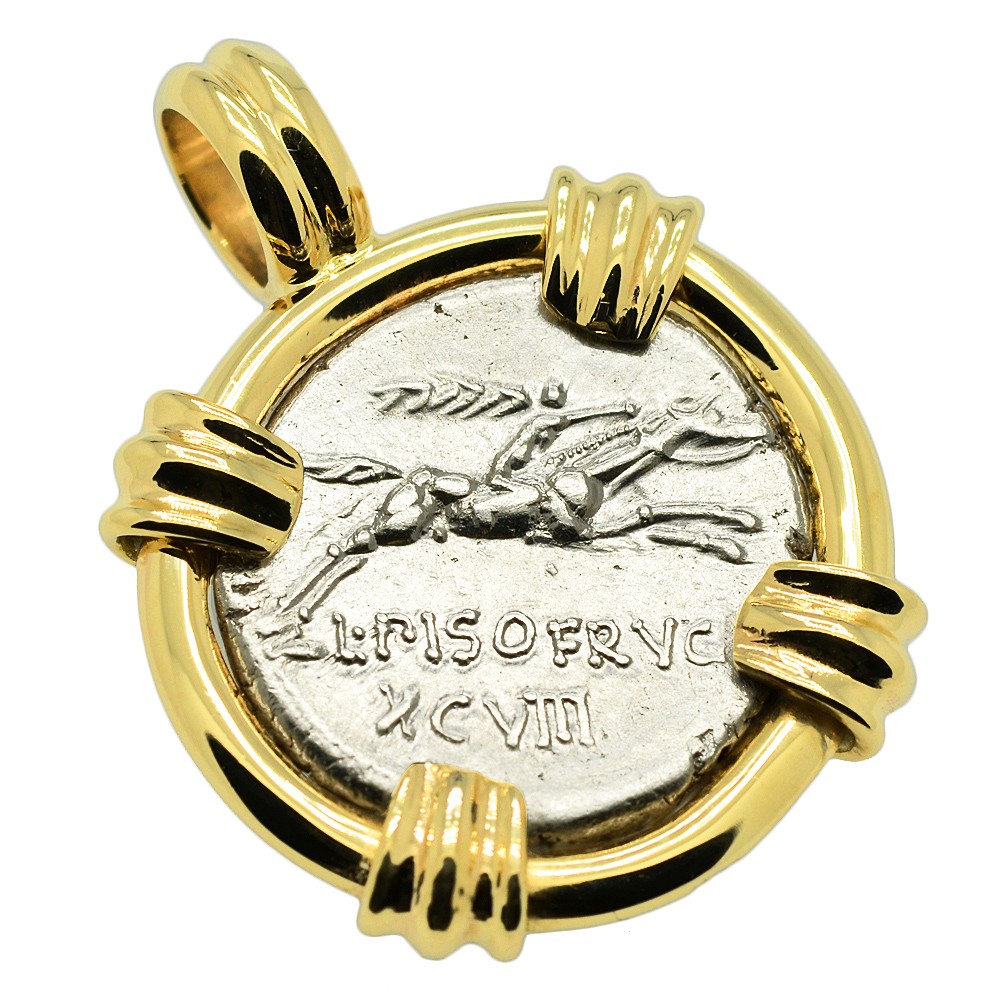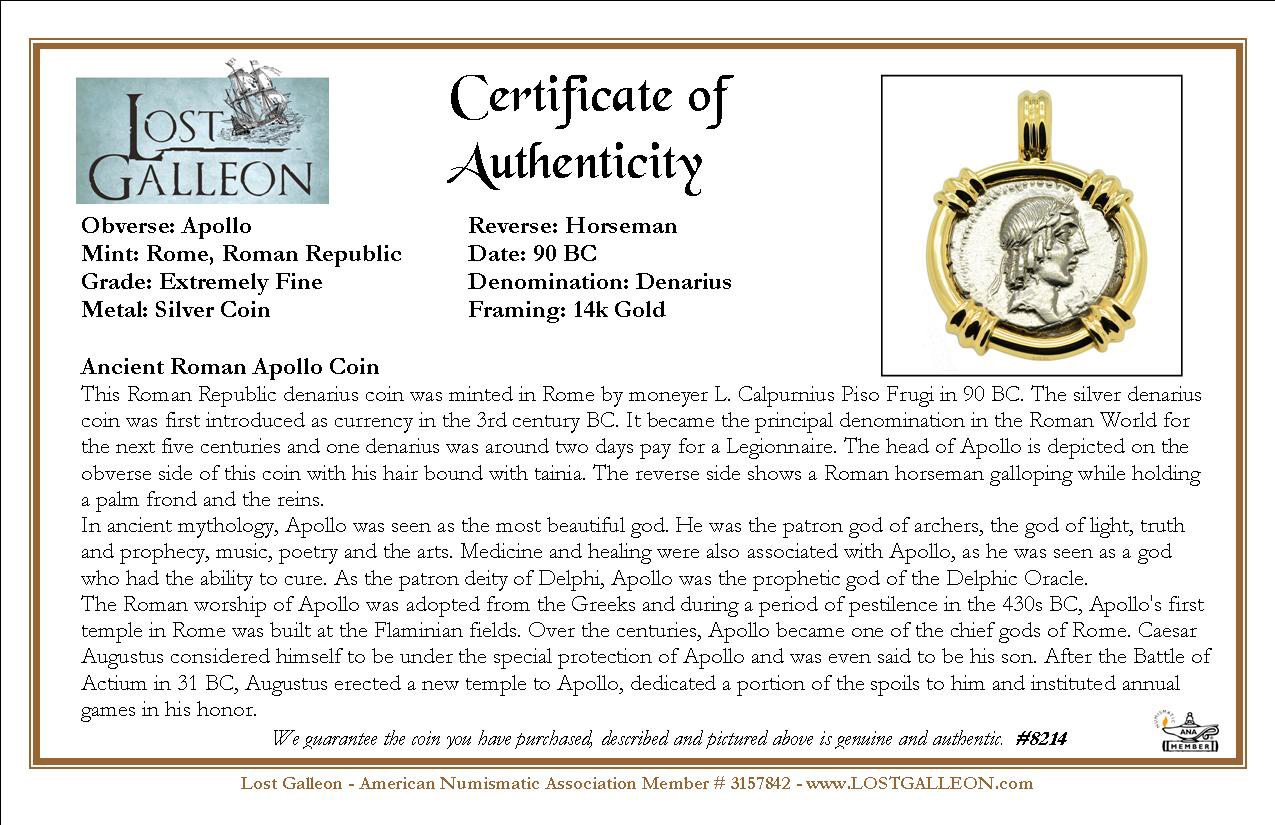 This Roman Republic denarius coin was minted in Rome by moneyer L. Calpurnius Piso Frugi in 90 BC. The silver denarius coin was first introduced as currency in the 3rd century BC. It became the principal denomination in the Roman World for the next five centuries and one denarius was around two days pay for a Legionnaire. The head of Apollo is depicted on the obverse side of this coin with his hair bound with tainia. The reverse side shows a Roman horseman galloping while holding a palm frond and the reins.