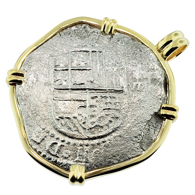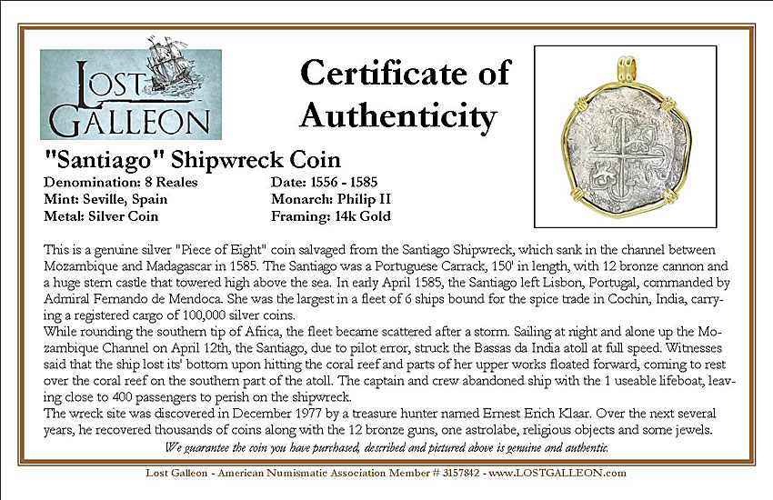 Original signed salvagers photo certificate included. This is a genuine silver "Piece of Eight" coin salvaged from the Santiago Shipwreck, which sank in the channel between Mozambique and Madagascar in 1585. The Santiago was a Portuguese Carrack, 150' in length, with 12 bronze cannon and a huge stern castle that towered high above the sea. In early April 1585, the Santiago left Lisbon, Portugal, commanded by Admiral Fernando de Mendoca. She was the largest in a fleet of 6 ships bound for the spice trade in Cochin, India, carrying a registered cargo of 100,000 silver coins.