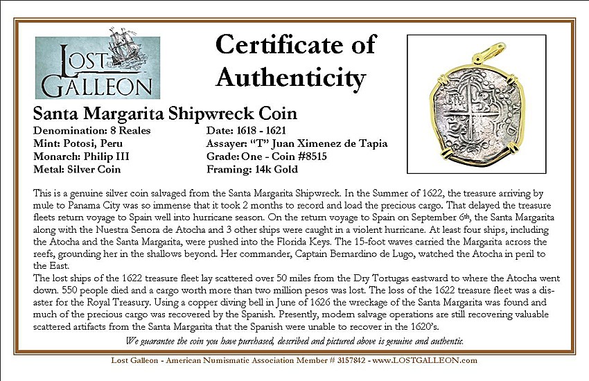 This coin also comes with Mel Fisher's Treasure Salvors Grade 1 Santa Margarita photo certificate #8515. This is a genuine silver coin salvaged from the Santa Margarita Shipwreck. In the Summer of 1622, the treasure arriving by mule to Panama City was so immense that it took 2 months to record and load the precious cargo. That delayed the treasure fleets return voyage to Spain well into hurricane season. On the return voyage to Spain on September 6th, the Santa Margarita along with the Nuestra Senora de Atocha and 3 other ships were caught in a violent hurricane. At least four ships, including the Atocha and the Santa Margarita, were pushed into the Florida Keys. The 15-foot waves carried the Margarita across the reefs, grounding her in the shallows beyond. Her commander, Captain Bernardino de Lugo, watched the Atocha in peril to the East.