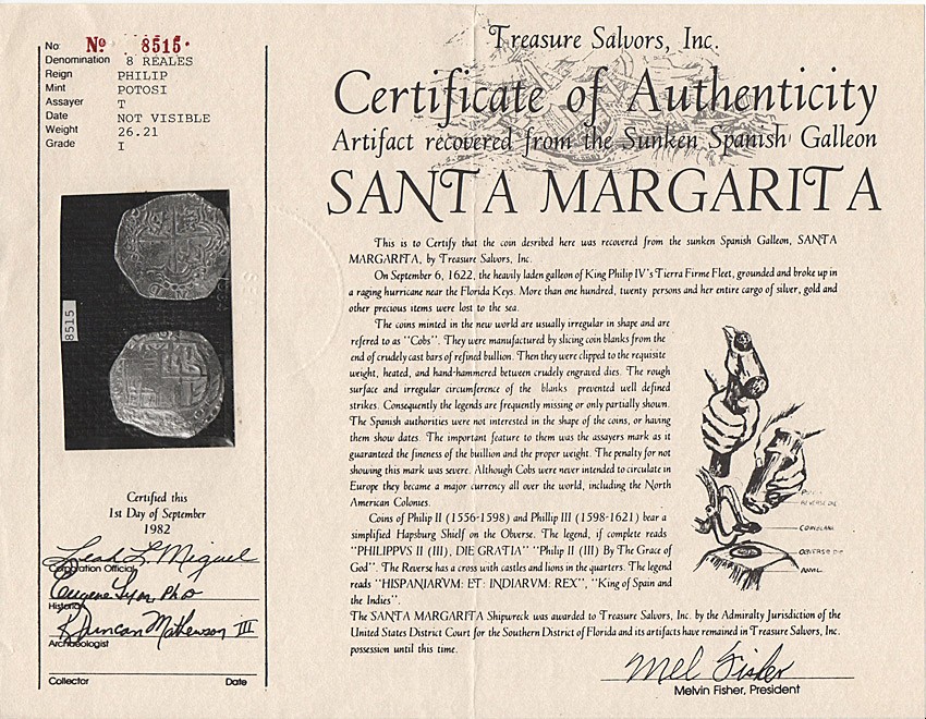 • Grade 1, Mel Fisher Treasure Salvors Certificate #8515