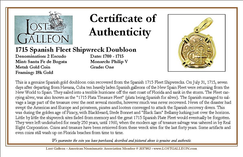 This is a genuine Spanish gold doubloon coin recovered from the Spanish 1715 Fleet Shipwrecks. On July 31, 1715, seven days after departing from Havana, Cuba ten heavily laden Spanish galleons of the New Spain Fleet were returning from the New World to Spain. They sailed into a terrible hurricane off the east coast of Florida and sank in the storm. The Fleet carrying silver, was also known as the "1715 Plata Treasure Fleet" (plata being Spanish for silver). The Spanish managed to salvage a large part of the treasure over the next several months, however much was never recovered. News of the disaster had swept the Americas and Europe and privateers, pirates and looters converged to attack the Spanish recovery divers. This was during the golden age of Piracy, with Blackbeard, Stede Bonnet and "Black Sam" Bellamy lurking just over the horizon.