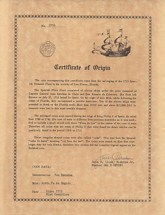 Original signed certificate included from famed treasure salvager Jack Haskins.